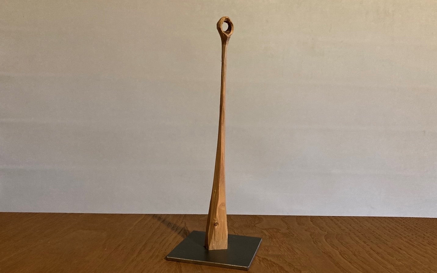 木の種類は檜。鉄の土台に支えられた高さ20cmの作品です。(自然の風合いを生かしているため、節の大きさは5cm程異なる場合があります。)