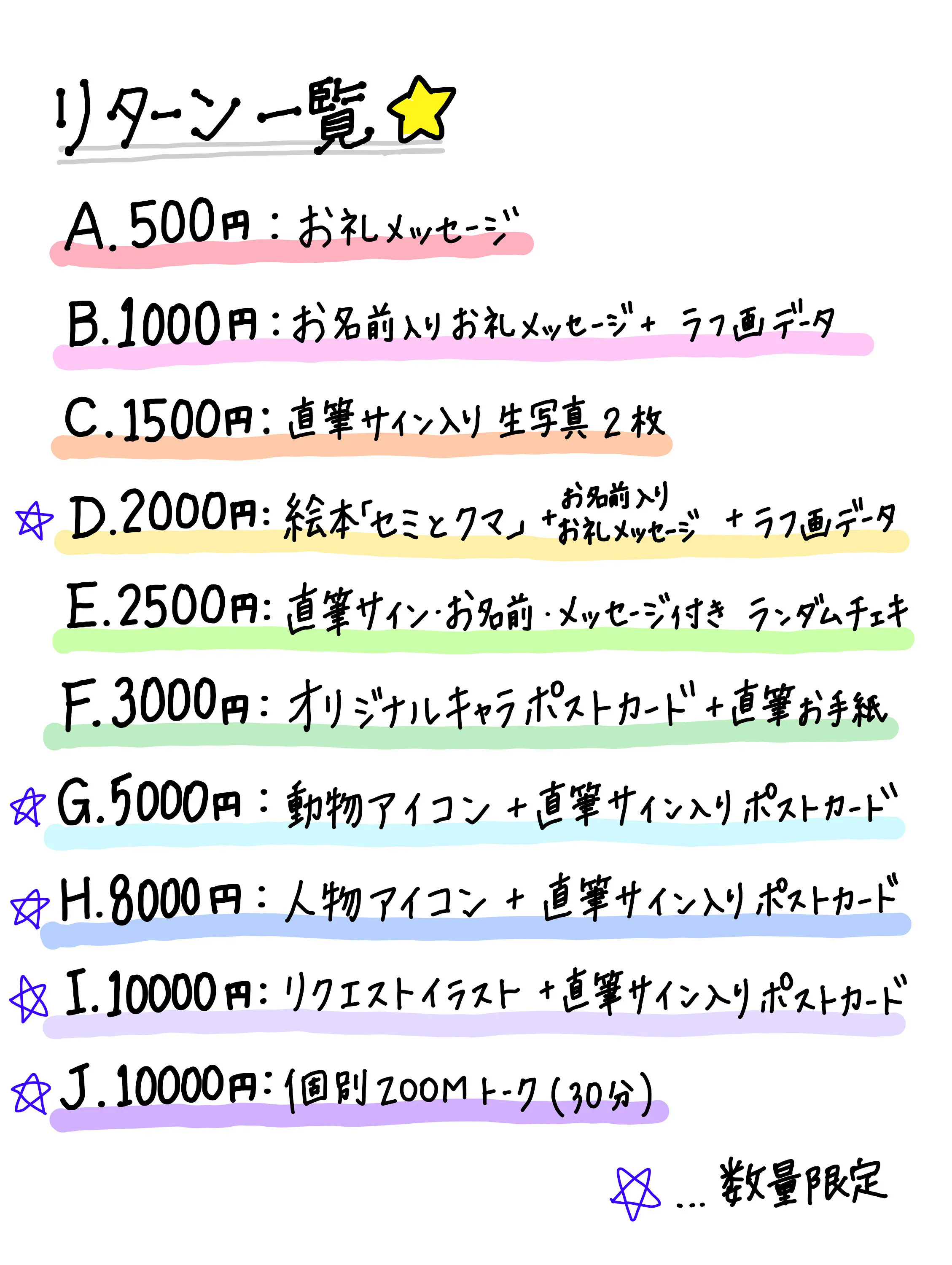 イラストに関するリターンの他に、イラストには興味がないけどタレント・辻村ゆりなを応援したい、という方に向けたものもご用意しました!個数に限りがあるものもございますのでご検討ください⭐️