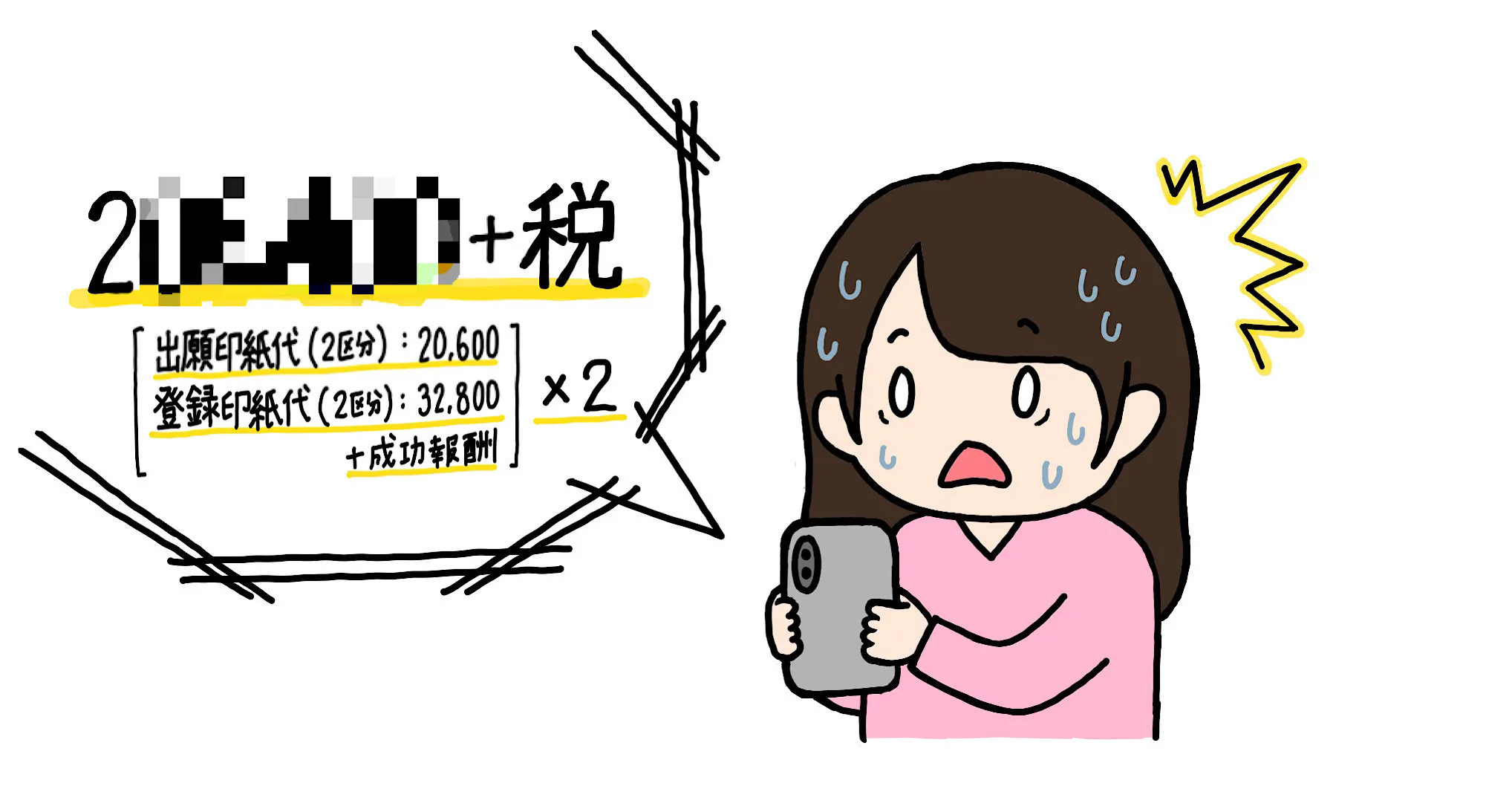 もちろん、弁理士さんにお願いをせずに自分で全ての手続きを行えば、「成功報酬」の部分はカットできますが、仕事をしながら自分で様々な手続きを行う自信がなく、できればプロの方にご依頼をしたいと考えています…(>_<)