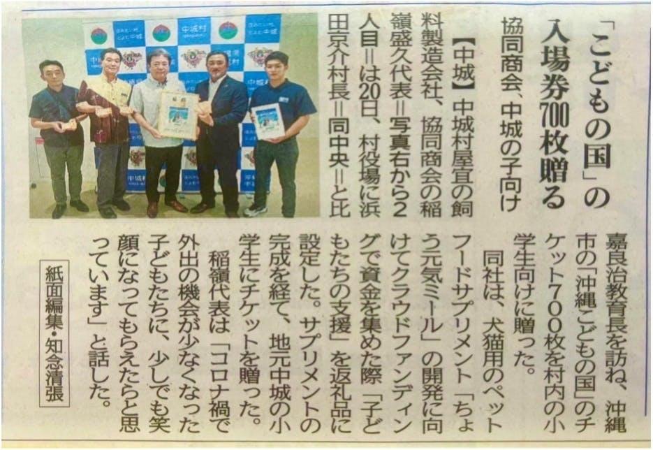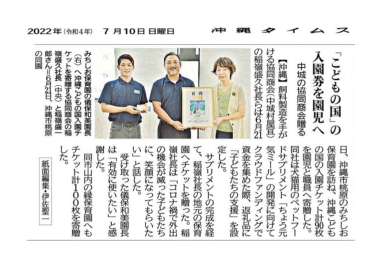 2022/06/28 10:246月25日の沖縄タイムス紙朝刊に、沖縄こどもの国様の来場チケットを700人の方々の元へ届くよう、中城村役場を通して寄贈した時の様子が掲載されました。こちらの寄贈は、リターン(返礼品)にある「3.子ども達への支援」にご支援いただいた皆様を代表してお届けしてきました。今回で、沖縄タイムス紙への掲載は2回目となります。このように、たくさんのメディア様に私たちの取り組みが注目して頂けているのはご支援いただいた皆様のおかげでございます。誠に感謝申し上げます。引き続き応援をよろしくお願いいたします。有限会社協同商会 有限会社イナミネ代表取締役 稲嶺盛久 もっと見るみちしお保育園様へ沖縄こどもの国チケットを寄贈