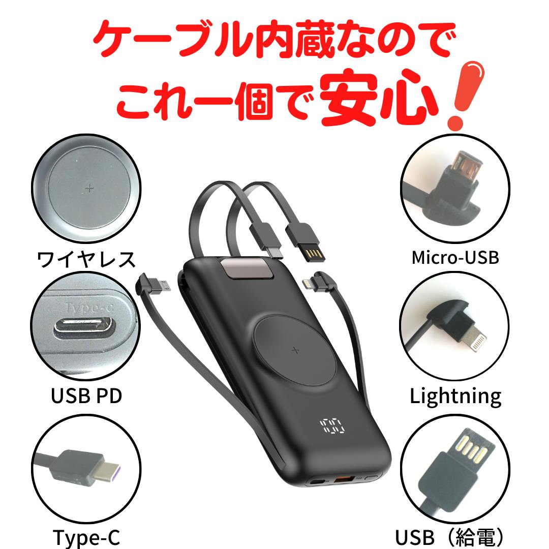 ※ワイヤレス充電、Micro-USB、USB PD(パソコンへの充電)、Lightning、Type-C、市販のデバイスほぼ全てに対応できます。
