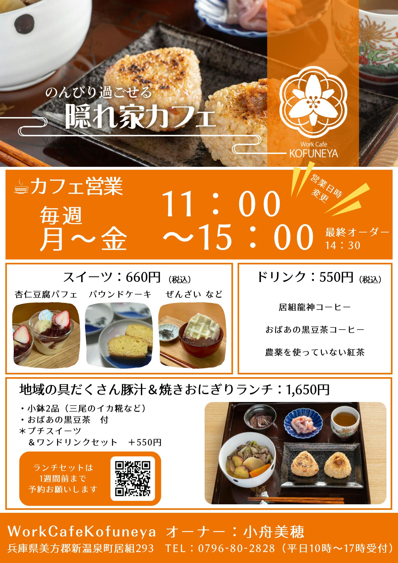 2022/05/26 12:00こんにちは!WorkCafeKofuneyaオーナーの小舟です^^いかがお過ごしでしょうか?3月26日にオープンさせていただいてから、2か月経ちました^^ありがとうございます!!クラウドファンディングでご支援いただいた方を始め県内外からも新温泉町に足をお運びいただきのんびり営業させていただいております^^オープンから、水曜日・金曜日はご予約、木曜日は11時~15時という形で営業しておりましたが少しずつオペレーションにも慣れてきましたので月曜日~金曜日11時~15時予約なしでご利用いただけるように変更いたしました^^スイーツ&ドリンクお楽しみください♪ランチのみ仕込みの関係で1週間前までにご連絡ください^^https://kofuneya.com/WorkCafeKofuneya/cafe遠方から新温泉町にいらっしゃる場合は交通手段、お宿を余裕を持って手配いただくためにお早めにご相談いただければと思います^^気候もよくなってきました!夏休み期間は、お宿も観光スポットも混み合うことが予想されますので、お気を付けください^^居組サンビーチ もっと見る