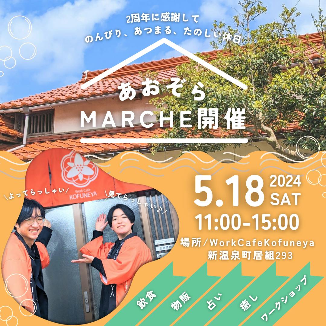 2024/04/16 12:11お世話になっております!WorkCafeKofuneyaの小舟です^^早いもので2024年3月26日でWorkCafeKofuneya2周年を迎えました!日頃の感謝を込めまして、また、構想当時から行いたかったマルシェを開催させていただくこととなりました^^カフェが平日しか開いていないこともあり、ご来店のタイミングを計りかねていた方にも、雪深い山陰地域への来訪を躊躇されていた方にも気候のよい今のタイミングでお会いできる場になればと思い、企画させていただきました^^今回は、オープン以来お世話になっている新温泉町、そして鳥取の方々にご出店いただき、大変にぎやかな空間となりそうです^^この場をお借りして、ご出店くださる皆様のことをご紹介させてください。◆YUKOさんUターン組の先輩移住者さんで、いつもわたしの話を聞いてくださったり、町内の方とつなげてくださる頼れるお姉さま!今回はタロット&数秘占い(15分1000円)をご提供くださいます♡わたしも占っていただけるの楽しみ!!◆山本さん新温泉町の山側、塩山というとっても見晴らしのいい素敵な場所で、お米作りや野菜作りをされている山本さん!趣味が講じてパン屋さんも始められて、今回パンやお菓子、冬の保存食かき餅をお持ちいただけることになりました♡パンはマジで早い者勝ち!笑◆セラピスト花織さん来店回数トップクラスのかおりん!2023年は月に1度出張施術にいらしてくださり、そのご縁で繋がれた方もたくさんいらっしゃいます!ふだんは鳥取吉岡で素敵なサロンをされてます♪今回は特別価格でイヤーキャンドル(40分4500円)、チャクラキャンドル(1箇所15分1800円※最大3箇所)をご提供くださいます♡受けなきゃ損!!◆KOKOROさん14年前、結婚を期にミャンマーから来られた英語講師のお姉さま♡大変な状況のミャンマーのために、なにか出来ることはないか?と、浜坂のシーグラスを使ったアクセサリー作りのワークショップや販売をされています!今回はシーグラスアクセサリーを店頭販売しております!売上は、ミャンマー支援に役立てていただきます♪◆アンボーさんわたしと同じく日本酒好き、、、が!!すごいレベルで日本酒好きなお姉さん!!地域おこし協力隊として昨年新温泉町にいらっしゃり、空き家バンクや移住定住のサポート、さらには但馬杜氏PRに関わっておられ、但馬杜氏さんの作っている日本酒を買い集めて、貴重な杜氏さんからの話を聞かせてくれます♡今回も圧巻のラインナップで、飲み比べをご提供くださいます♪日本酒好きの皆さま、ぜひご賞味ください!わたしもいただきます!!◆KOFUNEYA当店からは、山陰ジオパークの美しい海をイメージした「居組玉アクセサリー」のワークショップと新温泉町名物のじゃぶ&玄米おにぎりをご提供させていただきます♪1月に当店で開催いただいた移住者交流会でじゃぶのことを教えていただき、作ってみたところ大変好評で♪たくさん作りますので、召し上がってください^^ちなみに、今回出店いただく方々のうち、2名がウクレレ奏者♡さらに1名はバンド経験者!こりゃ演奏もしていただけるかな?!楽しみ楽しみ♪皆さんに楽しんでいただける1日になればと思います♪いえ、わたしが誰よりも楽しんでいるかと思います笑地域問わず、ぜひ遊びにいらしてください♪♪追加情報等はInstagramにてご案内いたします^^フォローしてください♪https://www.instagram.com/cafe_kofuneya/ もっと見る暑中お見舞い申し上げます