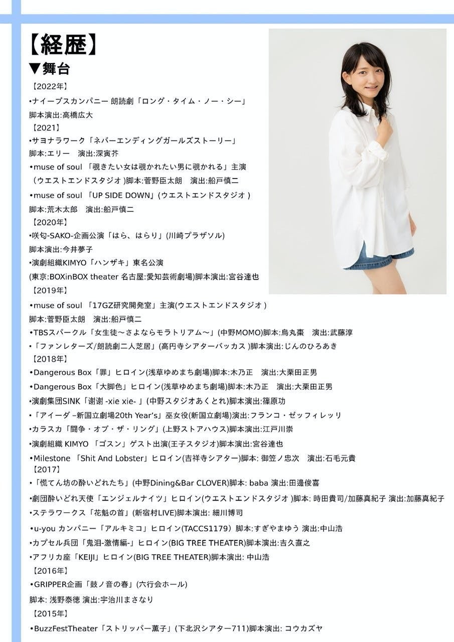舞台を中心に活動していますが、TVや企業様のCMモデル&ナレーション、イベント出演などのお仕事もさせて頂いてきました。