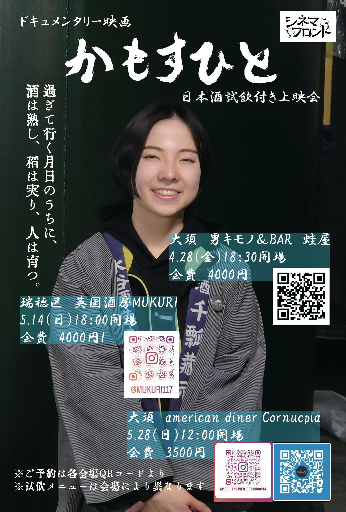 2023/03/24 15:32「かもすひと」監督の児玉篤史です。前回のイベントに続き、名古屋市内にて4月から5月にかけて3回の試飲付き上映会を開催することとなりました。試飲メニューの内容は、会場により異なります。ご予約は各店舗または私までメッセージにてご連絡下さい。4/28(金曜日)18:30より、大須の男キモノ&BAR蛙屋にて。参加費は4000円です。お店は普段は手作りのフードが美味しいバー営業と、オリジナルの男性用着物の販売も行っています。こちらのみ平日夜間開催です。定員16名様と少数のため、ご予約はお早めに。https://kaeruya.net/archives/information/kamosuhito5/14(日曜日)18:00より、瑞穂区の英国酒房 MUKURIにて。参加費は4000円です。スコッチウイスキーを始めとしたイギリス産のお酒、また日本を含め世界各国のウイスキーも充実。その時ある旬の食材を活かした独創的な料理にも定評があります。https://www.instagram.com/mukuri117/5/28(日曜日)12:00より、大須のamerican diner Cornucopiaにて。参加費は3500円です。肉厚のハンバーガーやTボーンステーキなどが自慢のアメリカンダイナーです。ダーツやボードゲームもあり、時々行われるゲームイベントも盛り上がっています。https://www.instagram.com/americandiner_cornucopia/以上の三会場にて、それぞれ異なる試飲メニュー付きの上映会を開催致します。奮ってご参加ください。 もっと見る