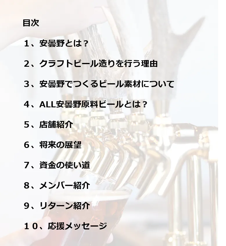 どうせなら、自分たちの手で年間通して安曇野原料のビールを届けたい思いで会社を立ち上げ、また、近年の農業問題(後継者不足、遊休荒廃地対策、自給率低下など)をクラフトビールから解決して新たな農業の形を目指しています。