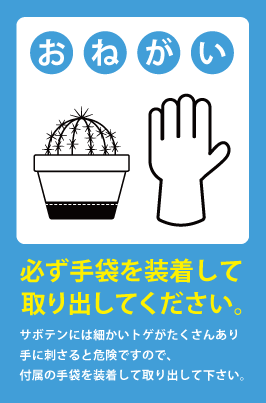 ・サボテンには細かいトゲがありますので、取り出しの際には付属の手袋をご使用の上、十分に注意して取り扱いください。またお子さんやペットの手の届くところには絶対に置かないようにしてください。
