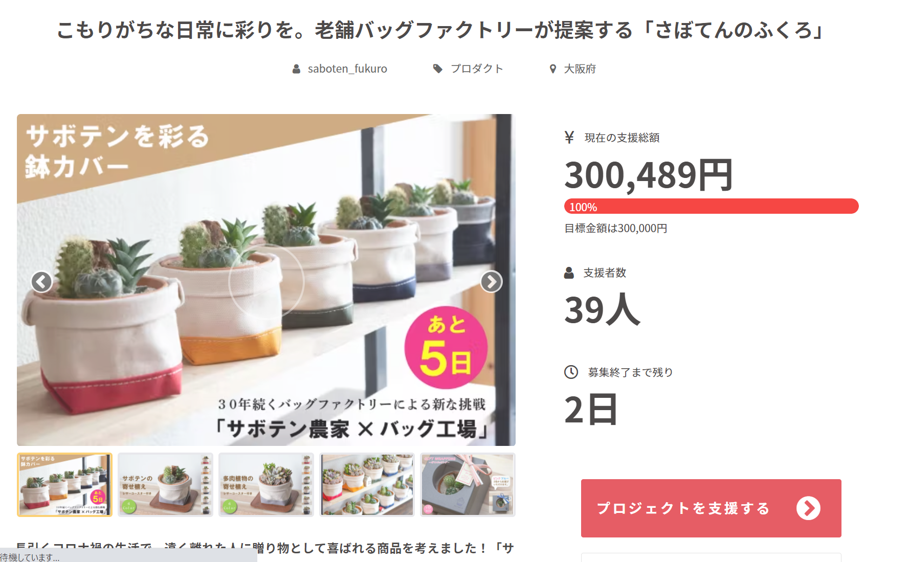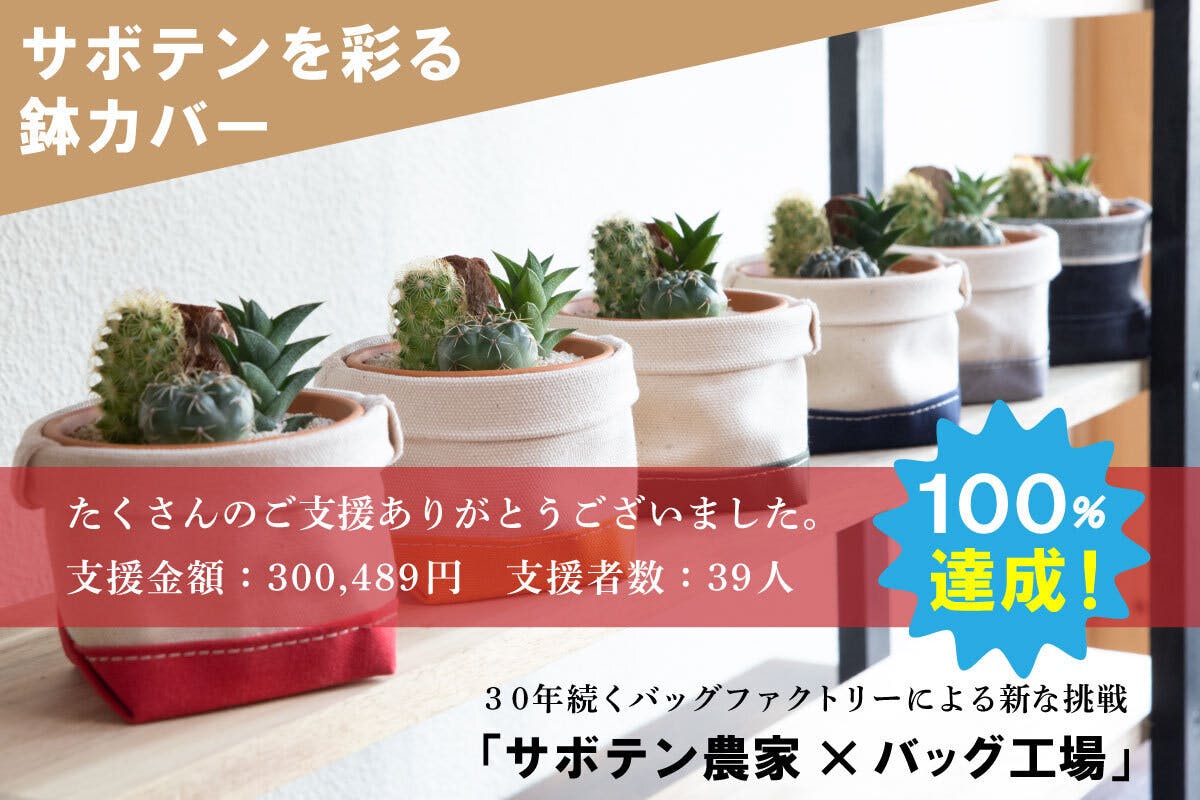 2022/04/01 10:05この度はさぼてんのふくろクラウドファンディングにご支援いただきありがとうございます。たくさんの方々のサポートいただき、無事目標金額の30万円を達成することができました。本当にありがとうございます。また、本プロジェクトの拡散・シェアーしていただきました関係者様の皆さまにも、感謝申し上げます。■支援金額300,489円 支援者数39人■リターン品の準備もできてきておりますので、順次発送させていただきます。お仕事に家事と忙しい現代社会でも植物で彩られた空間は癒しを与えてくれますので、大事に育てていただけると嬉しく思います。また今後の予定としまして、5月3日(火)・4日(水)に神戸国際展示場で開催される『アート&バザール』に出店します。サボテン・多肉植物はもちろん、artigianoが手掛ける革製品もたくさん商品取り揃えておりますので、お近くにお住いの方はぜひいらしてください。みなさまにお会いできること楽しみにしております。インスタグラム(@saboten.no.fukuro)をフォローしていただけると、今後の情報など含めてご案内をさせていただきます。https://www.instagram.com/saboten.no.fukuro/ もっと見る本日、最終日です。
