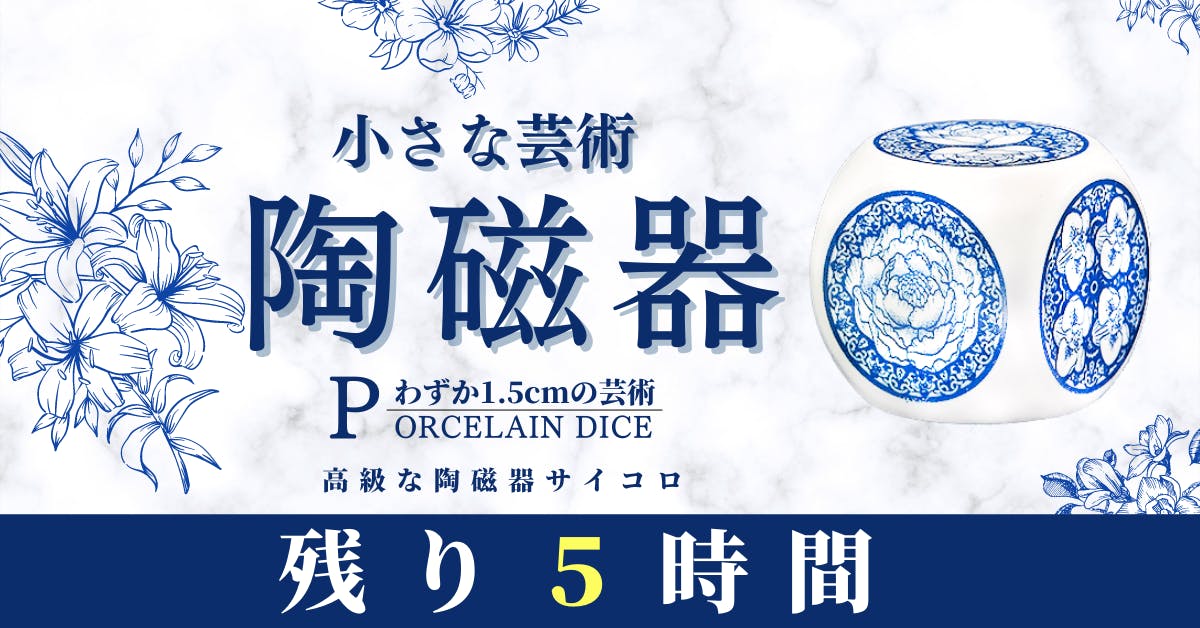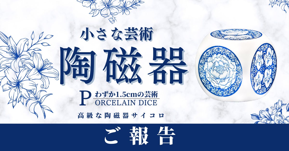 2022/03/25 14:30ご支援者の皆様ページをご覧の皆様お世話になっております。クラウドファンディング終了まで残り4日になりました。不慣れなクラウドファンディングで最初はどうやったら画像と動画だけで陶磁器サイコロの魅了がお伝えすることができるのかと不安で仕方ありませんでした。ただ皆様のご支援で、今では目標を大きく超える329%を達成いたしました。本当にありがとうございます!!この度、高級陶磁器サイコロ×2 早割20セット限定が完売いたしました!!ご支援ありがとうございます!早割キャンペーン商品も残り少なくなっております。なくなり次第、早割キャンペーン商品は終了となりますので、ご了承よろしくお願い申し上げます。早割以外の全ての商品がキャンプファイヤー 特別価格になっておりまして、通常販売予定価格より25%OFFになっております。3個セットも残りわずかとなっております。数量限定になっていますので、気になる方はお早めにご検討よろしくお願いいたします。ラインナップは以下の通りになります。3個セットをご購入でもデザインは1つずつ選ぶことができます。こちらの高級陶磁器サイコロですが、クラウドファンディング終了後、いつ販売されるかなど、まだ販売予定が立っておりませんので、ご検討いただいてましたら是非この機会にご支援よろしくお願い申し上げます。 もっと見る