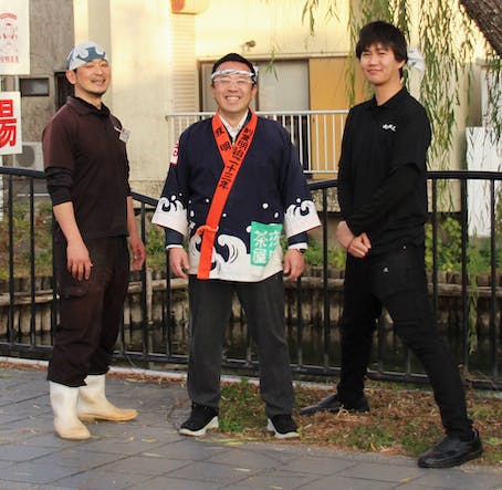 4代目の金子英典です。柳川市には、福岡県内3位の取扱高と有明海珍魚介類の水揚げで、日本一の魚種を誇る魚市場がございます。私たちはそこで夜明け前から、鮮魚や加工品用の原材料などを競り落としています。競り落としたものは3部門に分かれ、鮮魚部として店先に並ぶもの、食堂部の食材になるもの、お土産部の原材料になるものがあります。その他、柳川地元料理店にも卸させて頂いております。
