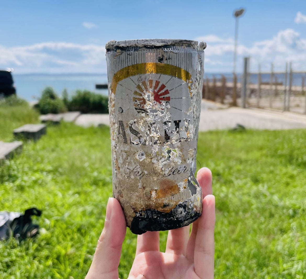 こちらはなんと推定50〜60歳?と思われるアサヒのビール缶です!調べてみたところ、1958年日本で初めて発売されたアサヒビールのデザインでした!やや劣化しているものの、原型やデザインは最低限留めており、半世紀以上海に眠っていたと考えられます。水中ゴミ拾いをして一年、こんなに長寿のゴミと出会ったのは初めてで、何気なくポイ捨てされたゴミがいかに長く海に蓄積されてしまうのか、痛感した1日でした。一方、自分が産まれるより前に捨てられたゴミを発見し拾うということは、なんだかロマンチックにも思えます。年月をかけ、このような状態になってもいまだに海の中で分解されず汚染し続けていることを伝えてくれる貴重なゴミです。