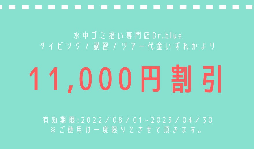 店頭でご使用できるクーポン券になります。ダイビング代、講習代、ツアー代のいずれかで精算時11000円を割引致します!