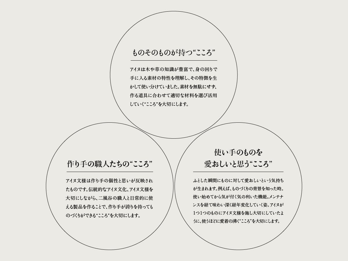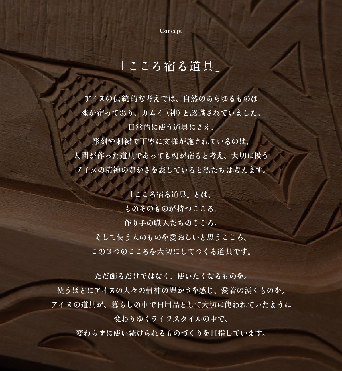 ふとした瞬間にものに対して愛おしいという気持ちが生まれます。例えば、ものづくりの背景を知った時。使い始めてから気が付く気の利いた機能。メンテナンスを経て味わい深く経年変化していく姿。アイヌが1つ1つのものにアイヌ文様を施し大切にしていたように、使うほどに愛着の沸く“こころ”を大切にします。
