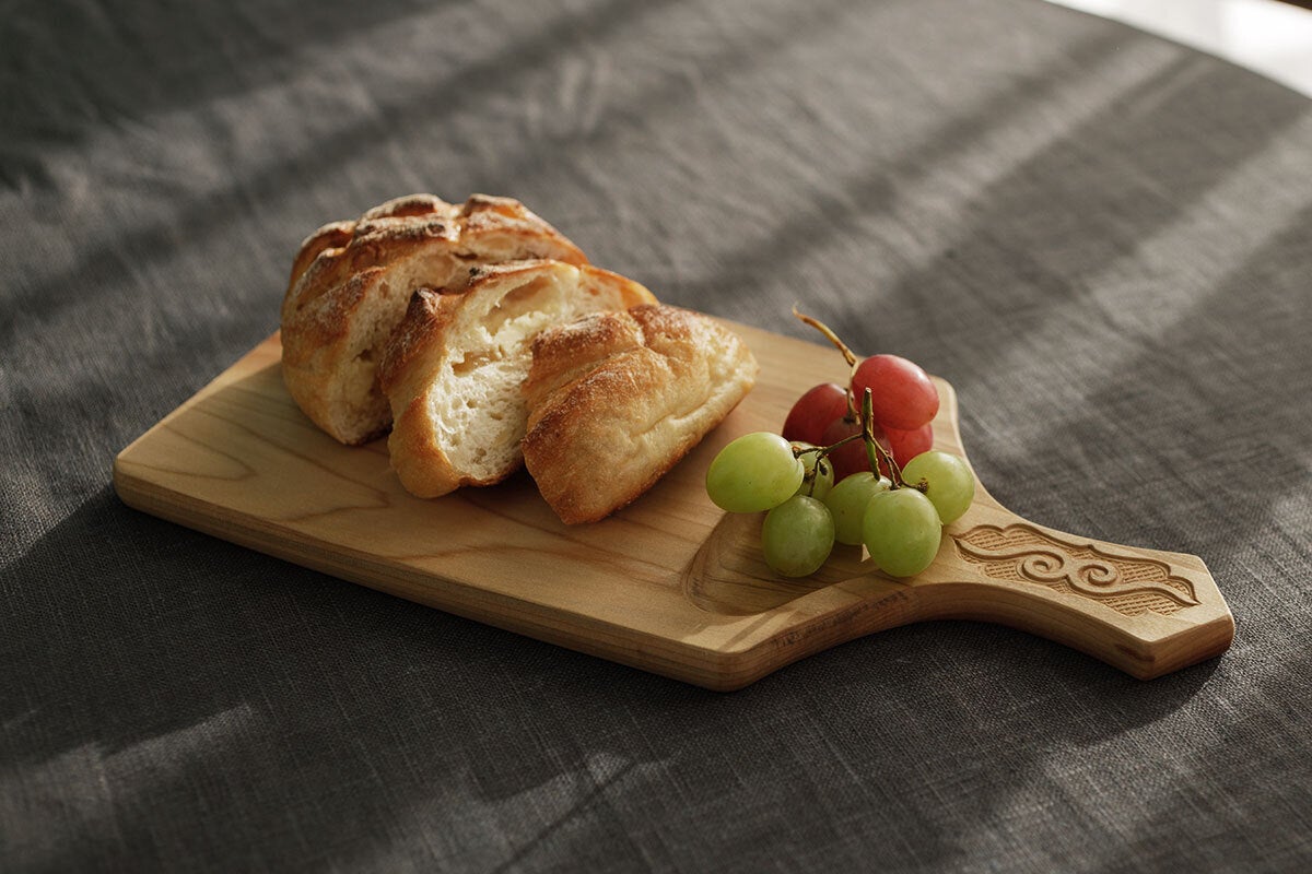 職人が作ったものには何か引かれるものがある。丁寧に彫られたアイヌ文様入りの道具たちの凛とした佇まい…その文様に引き込まれるようで、ただ立て掛けているだけでもキュンとする。カッティングプレートは切るためだけじゃなく、パンやおやつをのせてそのまま食卓に出したり、お肉とスパイスだけだって絵になっちゃう。こういったものは無くても困らないけど、あると日々の生活が楽しくなったり、大切に扱ったり、心が豊かになったり…日々過ごしていくのにとても大事な事だなと思う。