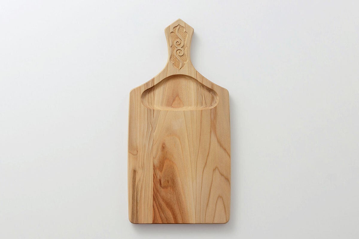 アイヌの人たちが実際に使用していた「メノコイタ」という伝統的な道具は、平らな部分で食材を刻み、くぼみ部分に盛り付けるという、まな板兼ボウルのような役割を果たしていました。小型のものは供応用として用いられ、料理をのせた状態で刃物と一緒に食卓に出し、お客は自由にそれらを切り分けて食べていたそうです。
