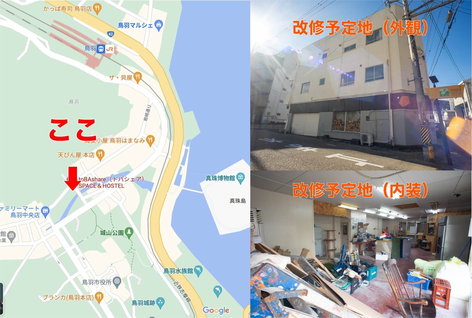 今回のプロジェクトはその鳥羽市街地(鳥羽駅から徒歩7分程)の場所にある空き店舗をリノベーションして、『地域活性型ポップアップストア』を作りたいと思っています!