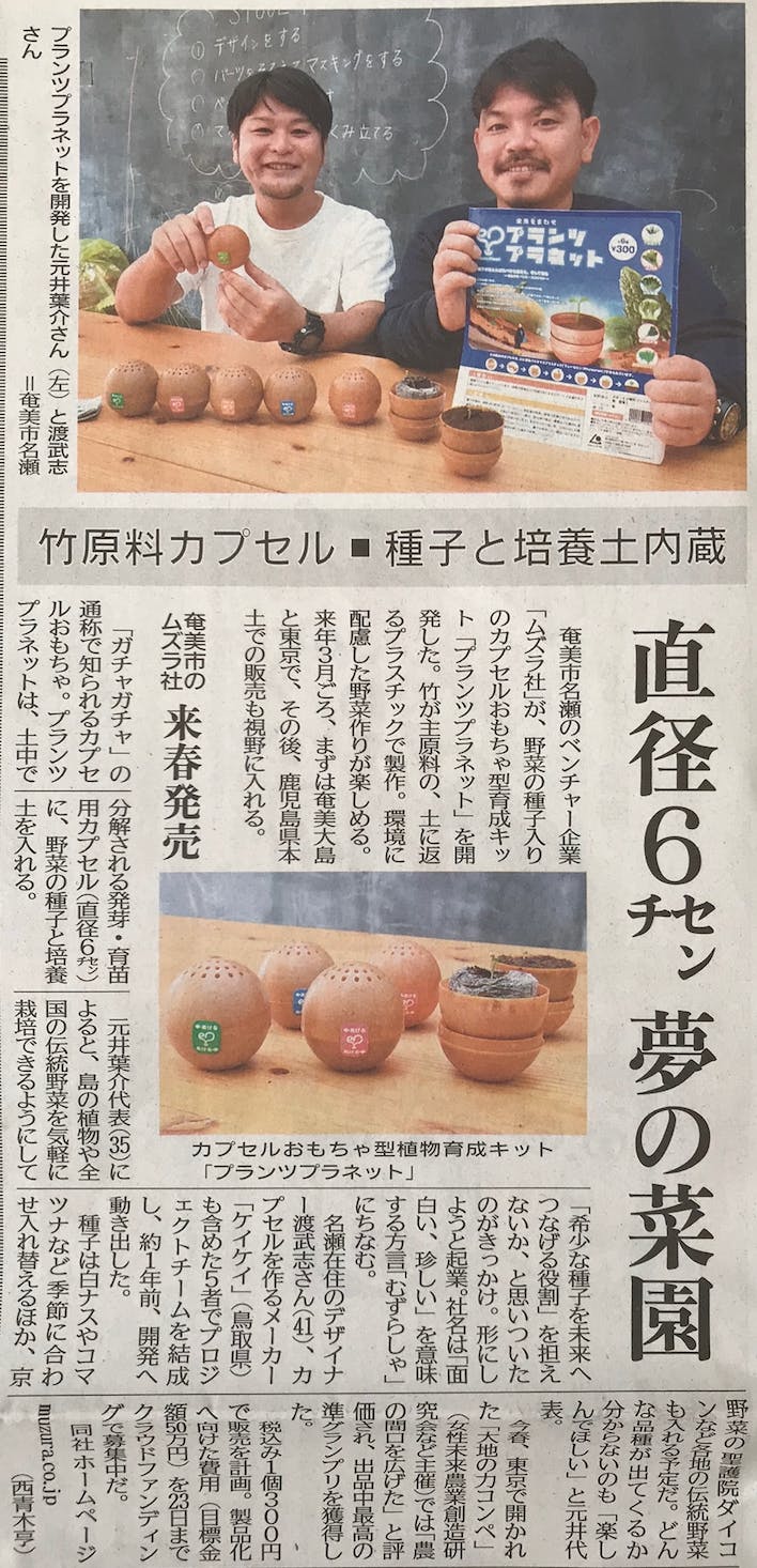 2018/11/18 11:18鹿児島の主読紙「南日本新聞」さんが記事にしてくださいました!鹿児島県で広く親しまれている南日本新聞さん。島外で暮らす友人や親戚からも「新聞見たよー!頑張ってるねー!!」という声をいただきました!クラウドファンディングを初めてから、友人の友人や、今まで繋がっていなかった方々に興味を持って声かけていただいてます。本当にありがとうございます!!クラファンは残り一週間ですが、この縁を大事にして行きたいと思います。皆さんにより良い「プランツプラネット」を届けられるように虎視眈々と準備中。引き続き応援よろしくお願いします!! もっと見る