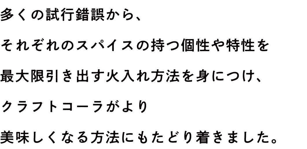その日から約1年間、30種を超える数々のスパイスの組み合わせから一つ一つ地道に試行錯誤し、スパイスを10種類前後に厳選。自信を持ってこれはコーラだ!と言える納得のレシピにたどり着きました。