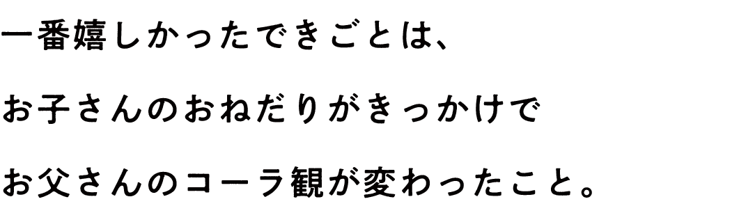 ある親子がお店の前を通った時に、小学生のお子さんがコーラ飲みたい!とパパに求めました。するとパパは「コーラなんてやめとけ!」と子供の要望を却下しました(笑)。お子さんはスネねてしまい、パパと口をきかなくなったそうで、パパは渋々コーラを買いに来てくれました。「お父さん、申し訳ありません…」と思いながらも、その時私は「コーノコーラは、てんさい糖を使った無添加の健康的なコーラです。なので安心して飲ませられますよ」と伝えました。