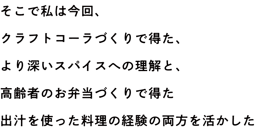 そして高齢者のための健康弁当づくりの経験を通して、塩分控えめだけどしっかりおいしい、出汁で丁寧に下味をつけた旨味たっぷりの健康スパイスカレーにたどり着きました。