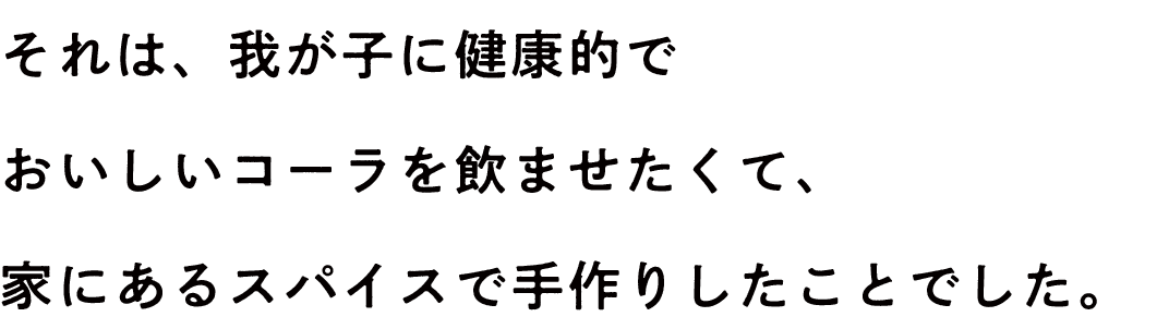 親である自分が納得できる形で、健康的でおいしいコーラを我が子に飲ませたいと思い、趣味のカレー作りで使うスパイスで、子供のために無添加で安心できるコーラを作ってみました。