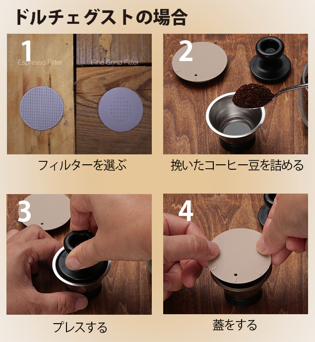 容器にお好きなコーヒー豆を詰めてフタをするだけ。豆の挽き具合に合わせて