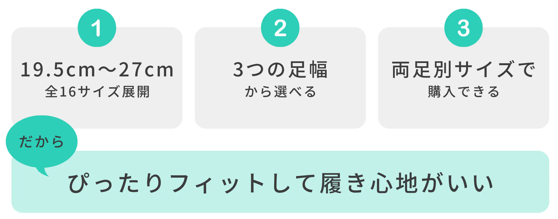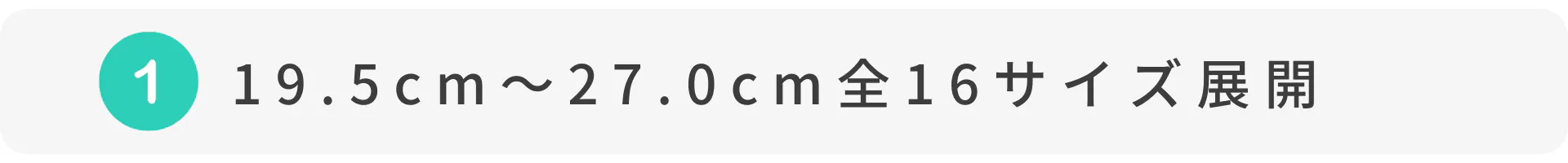 女性の足サイズのほぼ100%をカバーする、19.5cm~27cmの全16サイズをご用意。