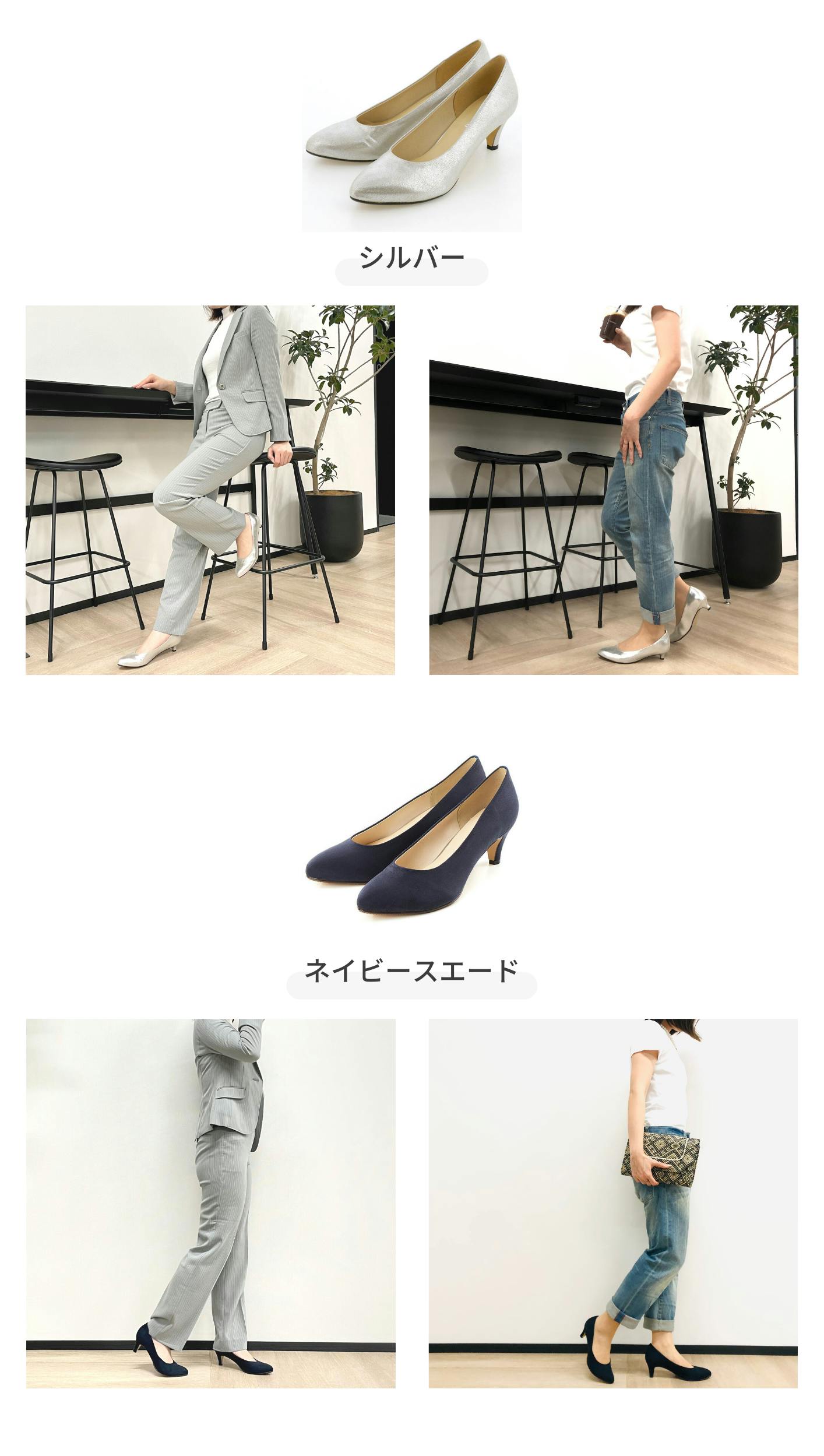 デザインは長時間履くと負担のかかる足指を考慮し、細すぎないポインテッドトゥのみをご用意。履きやすく、足元がスッときれいに見えるデザインに仕上げました。