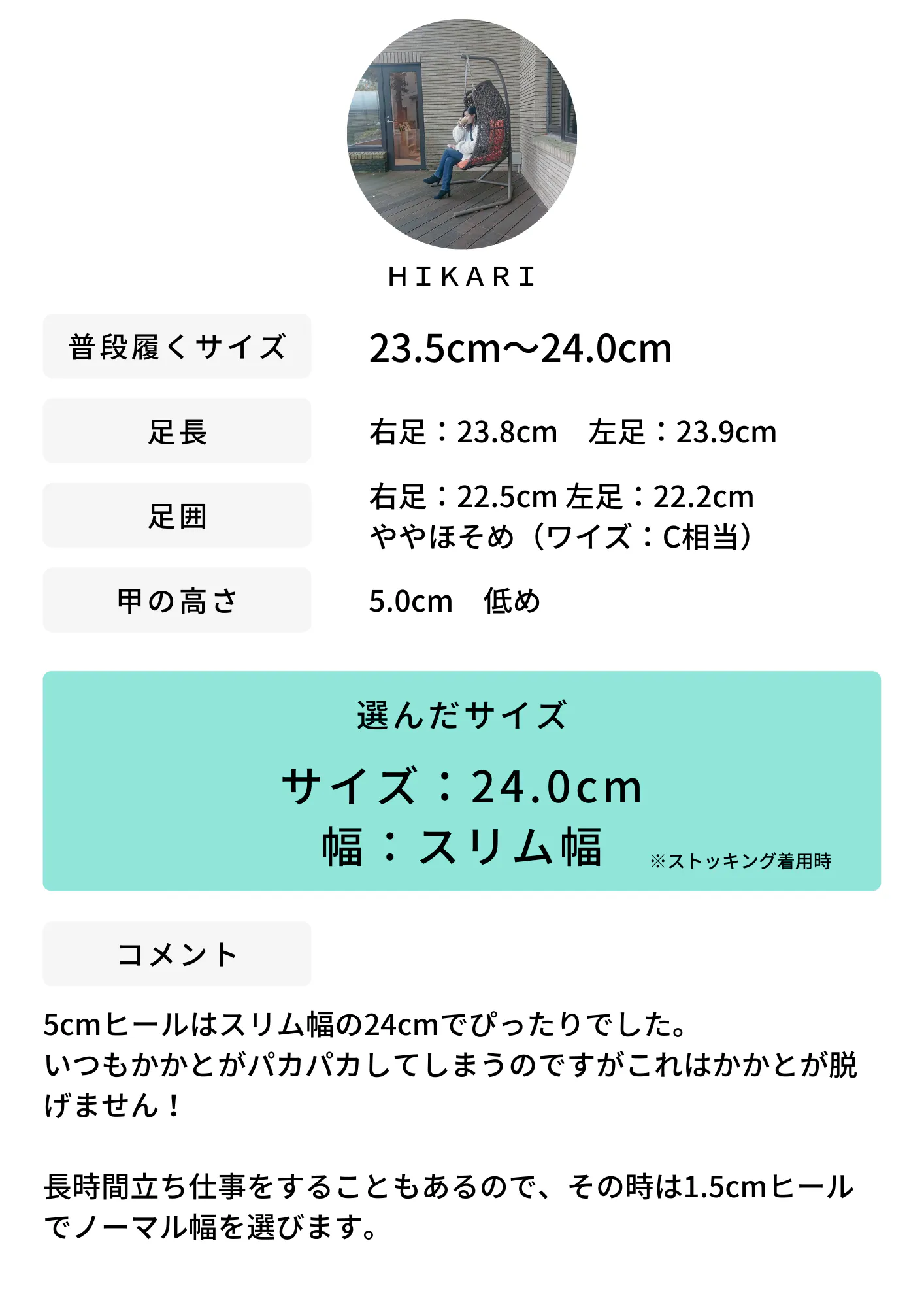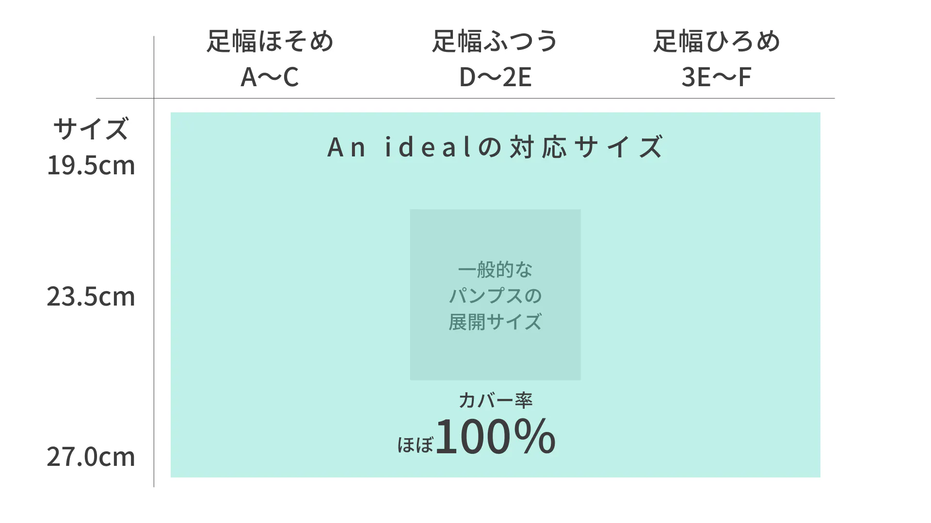 「足のサイズは大きいのに、幅が狭くてかかとがパカパカしちゃう…」など、足長サイズだけでは対応できないというお悩みも、An idealでは解決することができます。