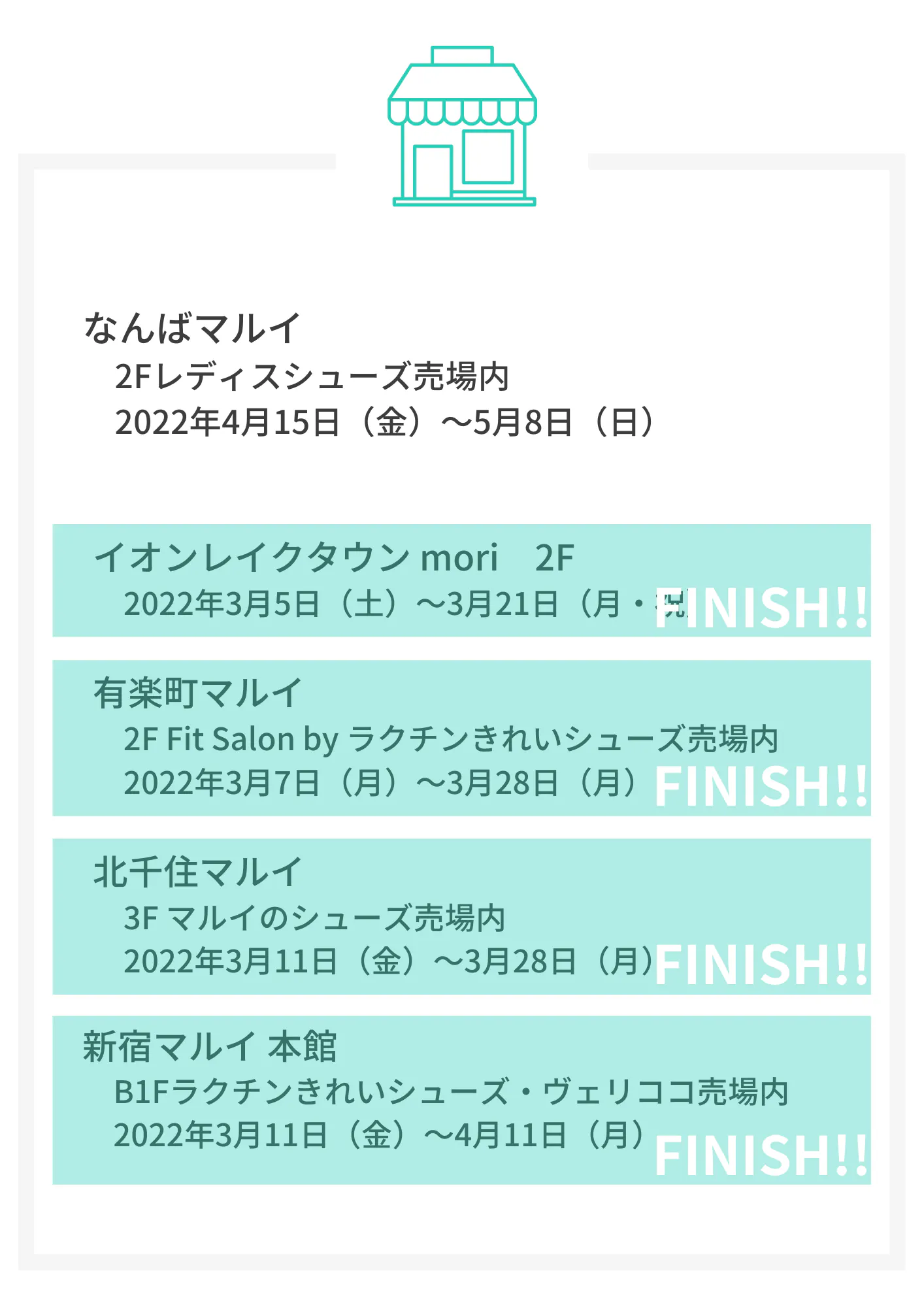 2023/09/17 17:57こんにちは!An idealです。第4弾プロジェクトがスタートして半月ほど経ちましたが、多くの応援コメントやご支援、本当にありがとうございます!引き続き目標金額達成に向け、応援のほどよろしくお願いいたします。リピーター様におトクなリターン【リピーター割30%OFF】なども、まだご用意ございますので、ぜひ気になる方はチェックしてみてください。第4弾プロジェクトはこちら>第4弾ということで、新色カラーも追加してスタートしておりますが、オンライン上だけだとなかなかサイズ感や色味など心配な方も多いですよね…そこで今回は、9月後半に4店舗同時開催でイベント展開します!店頭ではスタッフによる無料の足計測やフィッティングのアドバイスなどを行っており、「色味やサイズ感だけを知りたい」という方のご来店もぜひお待ちしております♪ぜひお近くにお越しの際はお立ち寄りくださいませ。▼有楽町マルイ1Fカレンダリウム▼9/16(土)~9/29(金) 有楽町駅側入口すぐです♪ \神戸地区初開催/▼神戸マルイ1Fカレンダリウム▼ 9/16(土)~10/1(日) エスカレーター脇のイベントスペースです♪▼北千住マルイ2Fカレンダリウム▼9/5(火)~9/28(木) 北千住駅からの2F入口すぐです♪▼イオンレイクタウン mori 2F ▼9/20(水)~10/1(日) kazeとmoriの連絡通路のすぐそばです♪また、会場が遠く試着に行けないがサイズ感が不安、どのサイズを選べばいいかアドバイスが欲しい…などございましたら、お気軽にメッセージからお問合せください!メッセージ受け取り後、3日~1週間以内にご返信にてサイズ選びなどのサポートをさせていただきます。ぜひご不明点ございましたらお問合せくださいませ。引き続き当プロジェクトの応援、どうぞよろしくお願いいたします♪ もっと見る