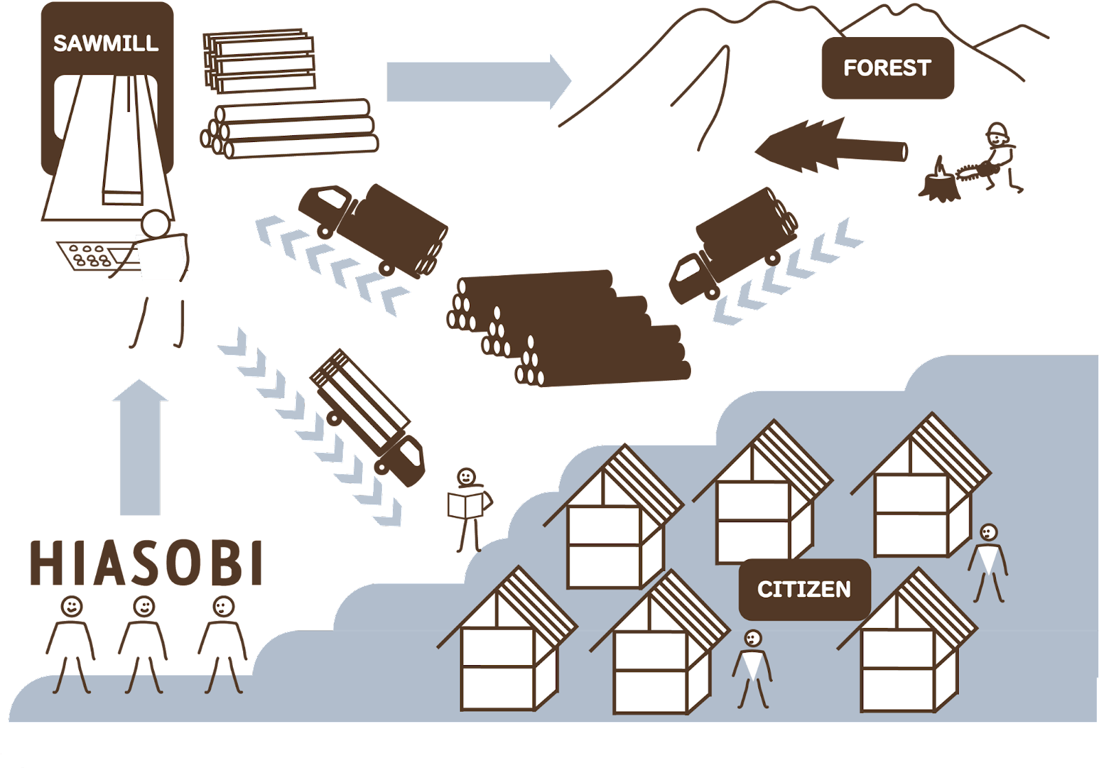HIASOBIは製材所の端材から生まれました。1本の木を無駄なく使い切ることは、衰退した日本の林業に収益を生み出し、森林資源の循環に繋がります。