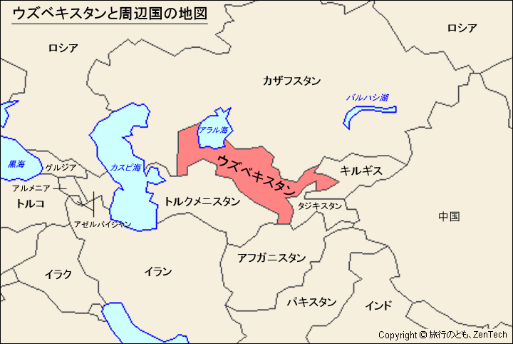 北にカザフスタン、南にトルクメニスタンやアフガニスタン、東にタジキスタンやキルギスタンの5ヶ国と隣接しています。世界に2ヶ国しかない「二重内陸国」(国境を最低2回超えないと海に達しない)の1ヶ国でもあります。