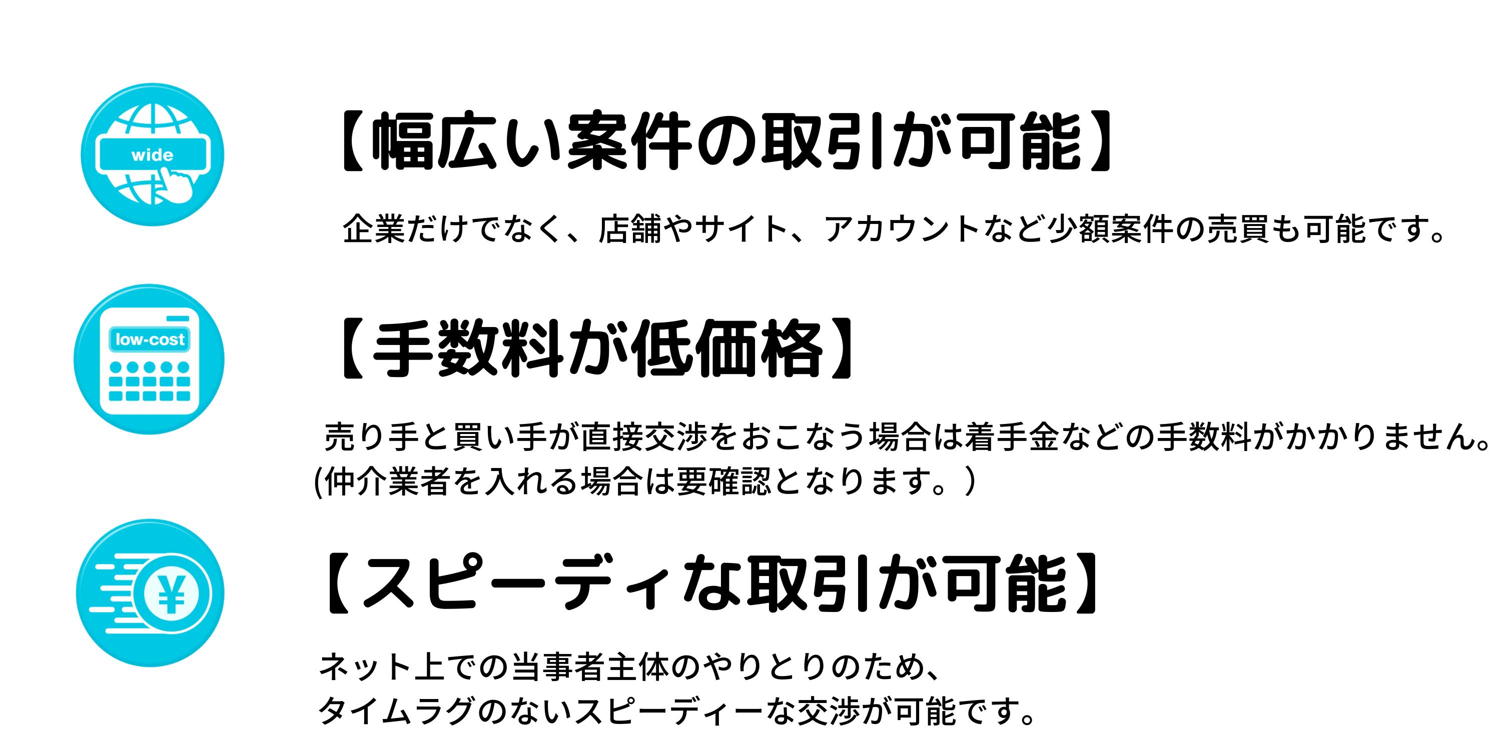 など、個人が所有している小規模案件中心に取り扱うため、売り手と買い手との間で売買しやすい案件が豊富です。