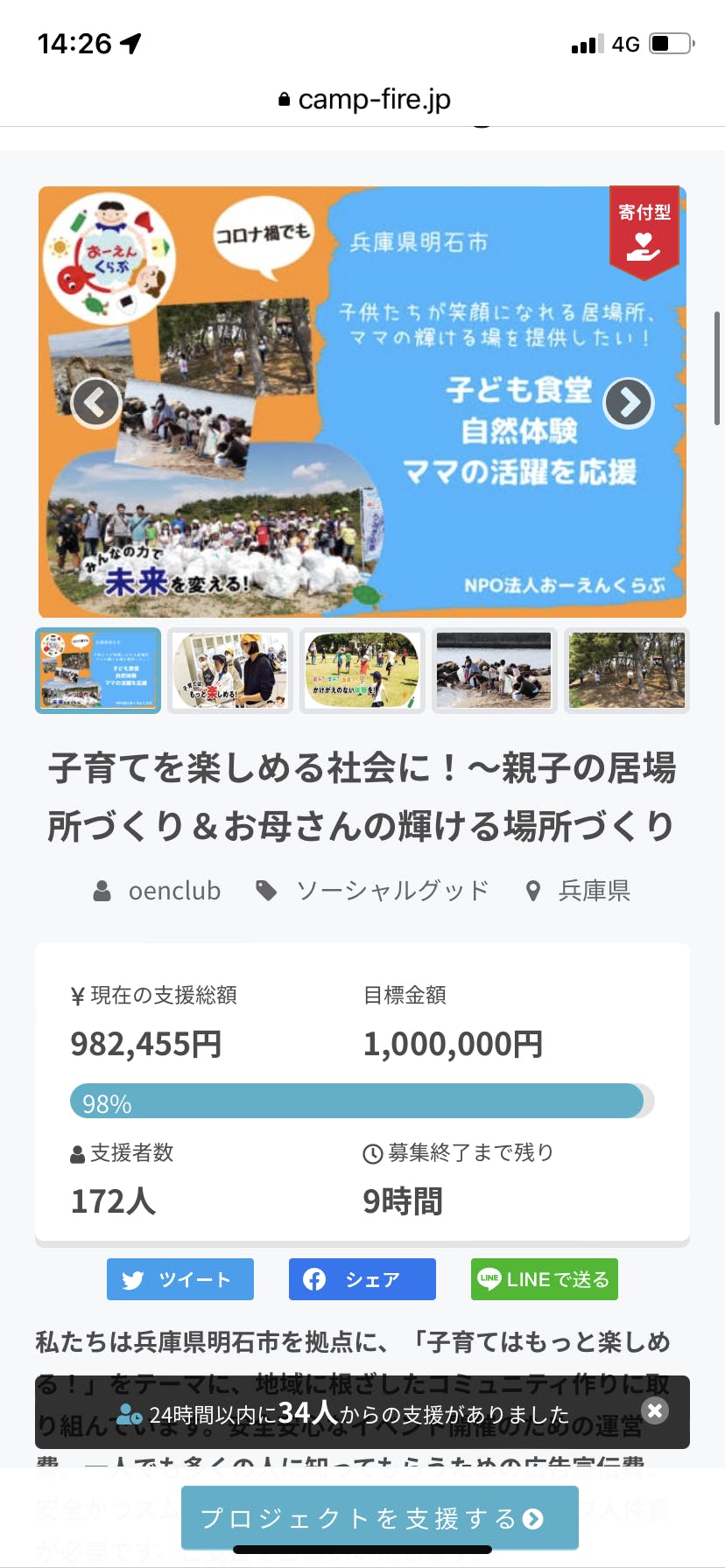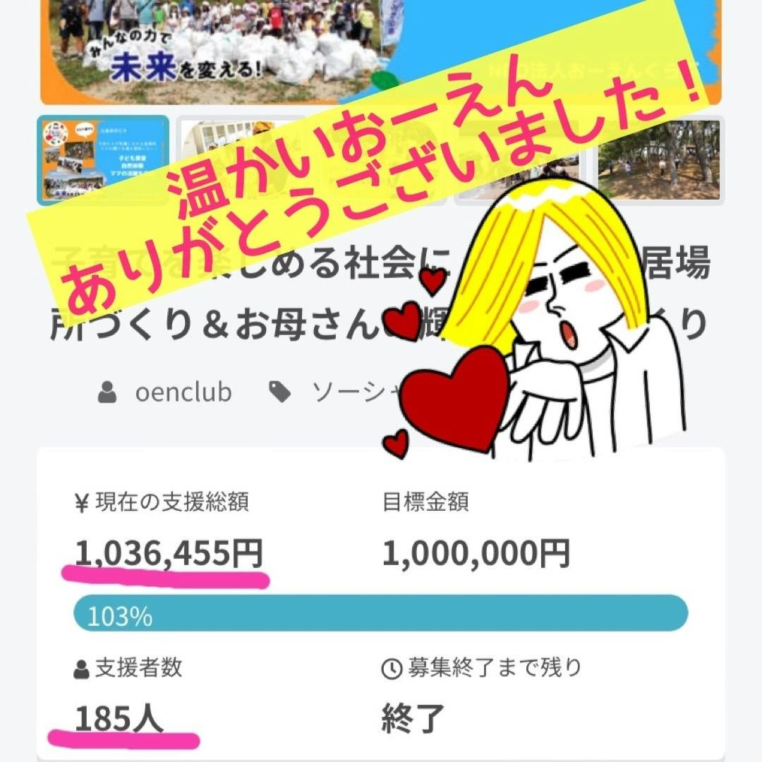 2022/06/01 09:39おはようございます(^O^)/おーえんくらぶ代表理事のおかなみです。昨日の24時を持ちまして、おーえんくらぶ初のクラウドファンディング挑戦が終了しました。185名の方に、103万6455円のご支援をいただきました。クラファンサイトへの手数料を差し引きまして、93万3846円を活動資金として使わせていただきます。本当にありがとうございました。普段おーえんくらぶやスタッフに関わってくださってる方はもちろん、私たちのことを知らない方にまで応援されることを経験させていただきました。初めて味わう達成感…言葉になりません。反省点は山のようにありますが、クラファン担当てっちゃんからは、「なにはともあれ、みんなよく頑張った!みんなハナマル!みんな100点!!」という言葉をもらって、ホッとしてます( *´艸`)♡リターンの送付や設定に向けて、動きます。同時に、夏の陣の企画も始めます。イベントに参加していただくことが、何よりのおーえんになりますので☆今度とも、おーえんくらぶをよろしくお願いします(^^♪ もっと見る