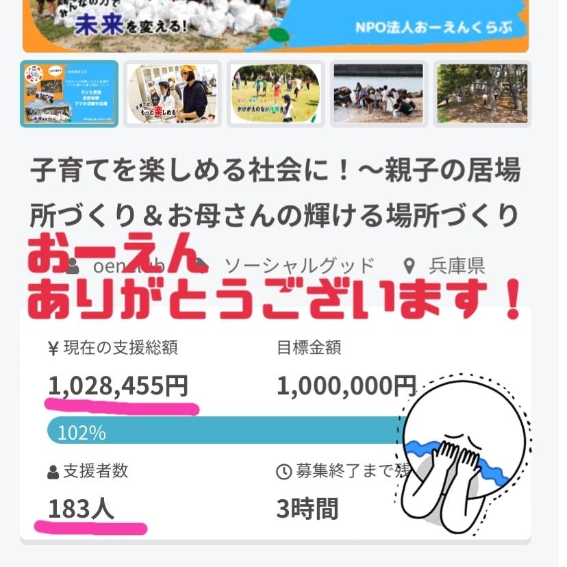 2022/05/31 20:45こんばんは!ありがとうございます(T_T)NPO法人おーえんくらぶが初めて挑戦したクラファン、無事目標を達成いたしました‼ 応援いただいた方、支援いただいた方、達成を祈ってくださった方、運営スタッフのみんな、本当にありがとうございました╰(*´︶`*)╯♡ ただ、ワタクシ…手数料17万円のことをすっかり失念しておりましたorz リターンが魅力的だと感じられましたら、ご支援お願いいたします。 ちなみに、15万円のリターンが残っております。何って?私の講演会でーす(笑) お母さんたちだけの力でNPO法人を作り上げ、強い組織を作った秘訣。 今回のクラファン、残り20日で80万円を達成できた学びと実践をシェアさせていただきます‼ 必要な方がおられたら嬉しいです♡あと3時間‼引き続き、応援よろしくお願いします(⌒▽⌒) もっと見る