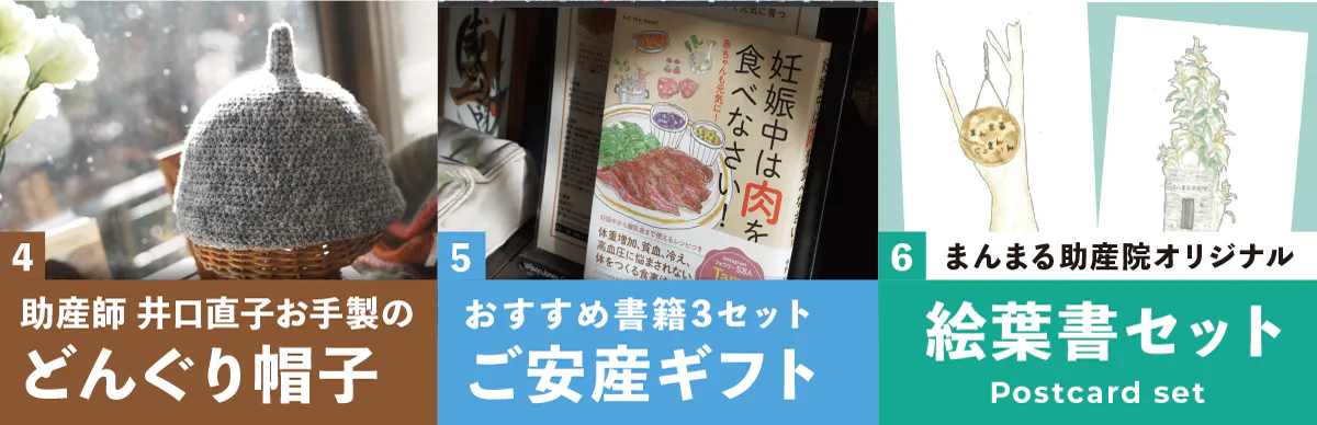 まんまる助産院では、赤ちゃんの健全な発育・発達のために高たんぱく離乳食を勧めています。離乳食のレシピが載っているカードをセットにしてプレゼントいたします。
