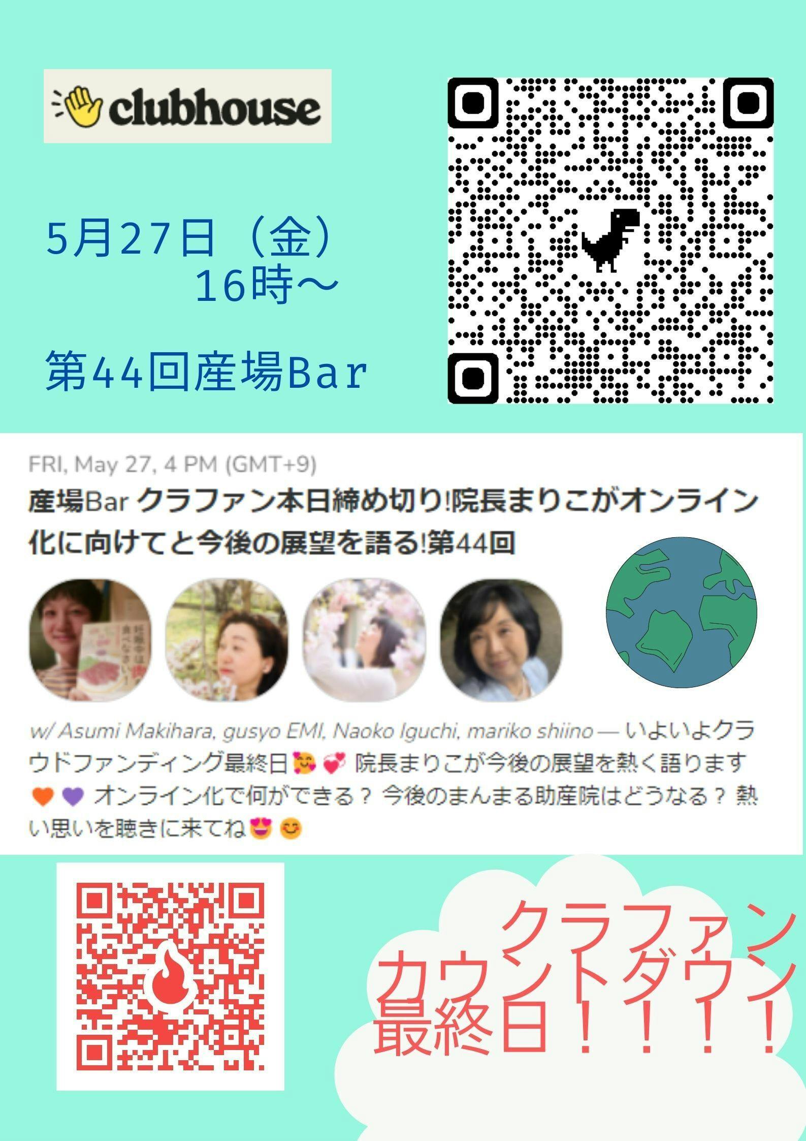 2022/05/27 18:01今日の23時59分にクラウドファウンディングが締め切りとなります。多くの皆様にご支援応援いただきありがとうございました。このオンラインでも受講できるからこそ、「妊婦の学校」として遠方の方にもサービスできるように今後とも活動してまいります。あと2時間、まだまだ、目標額まで頑張りたいと思いますので、皆様ご支援よろしくお願い致します。今日再度22時にクラブハウス”産場Bar”でまりこ院長がこのクラファンのことを話しますので、どうぞお聞きください。https://www.clubhouse.com/join/%E7%94%A3%E5%A0%B4bar/ZVdKwfvc/xXJVQ7qK?utm_medium=ch_invite&utm_campaign=hxnFDUgHxZdDwi0csPD6hQ-210282&fbclid=IwAR25SROzNu9SLO0_SIWYsn51jd97yH5V5_-Q_pSQFUfAf02s86G4FuFq3i8 もっと見る