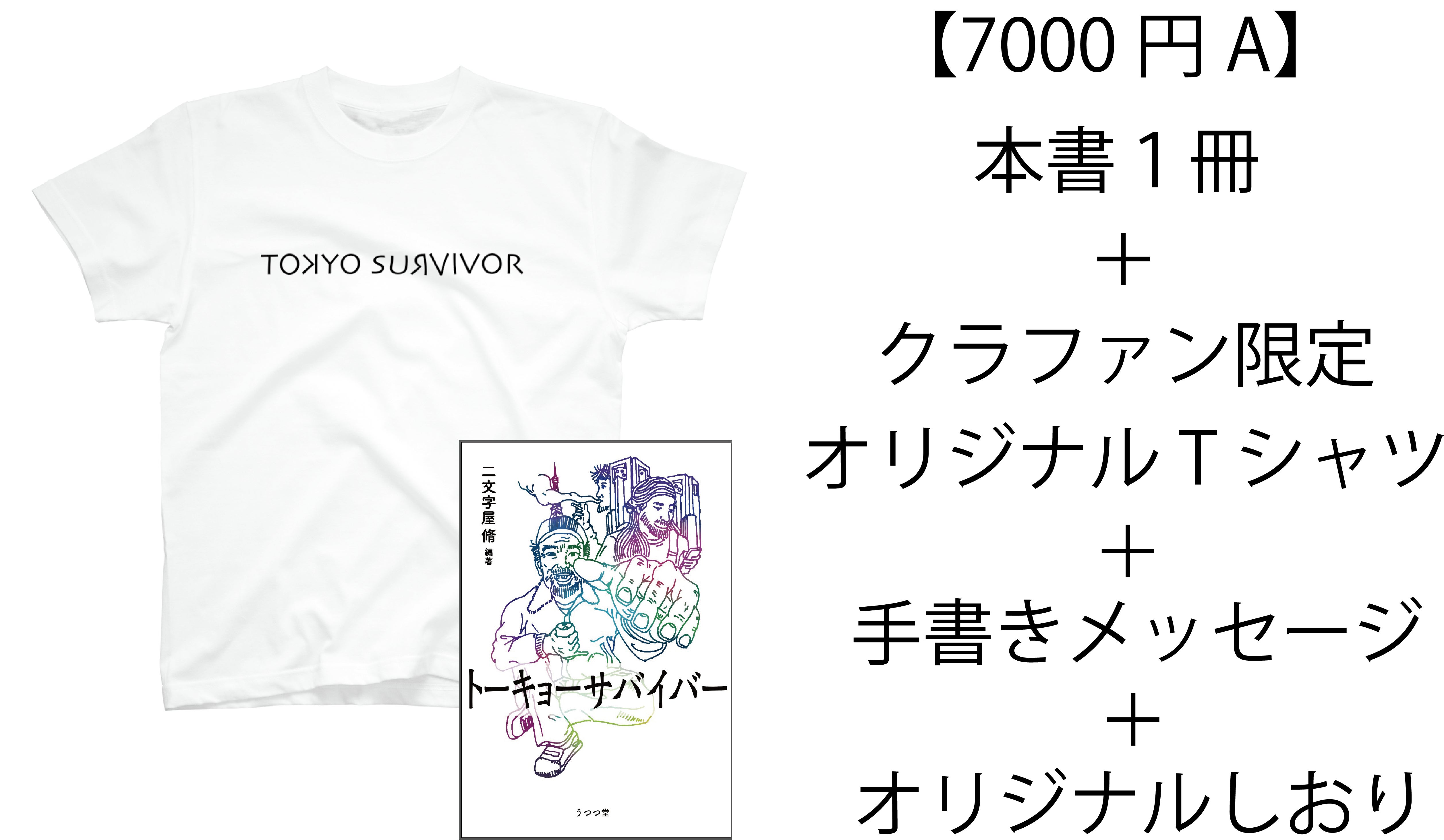 本書『トーキョーサバイバー』1冊。クラウドファンディング限定のオリジナルTシャツ1枚(S〜XL より選べます)。執筆者でもあるプロジェクト参加学生からの手書きメッセージ1枚とオリジナルしおり1枚を同封いたします。
