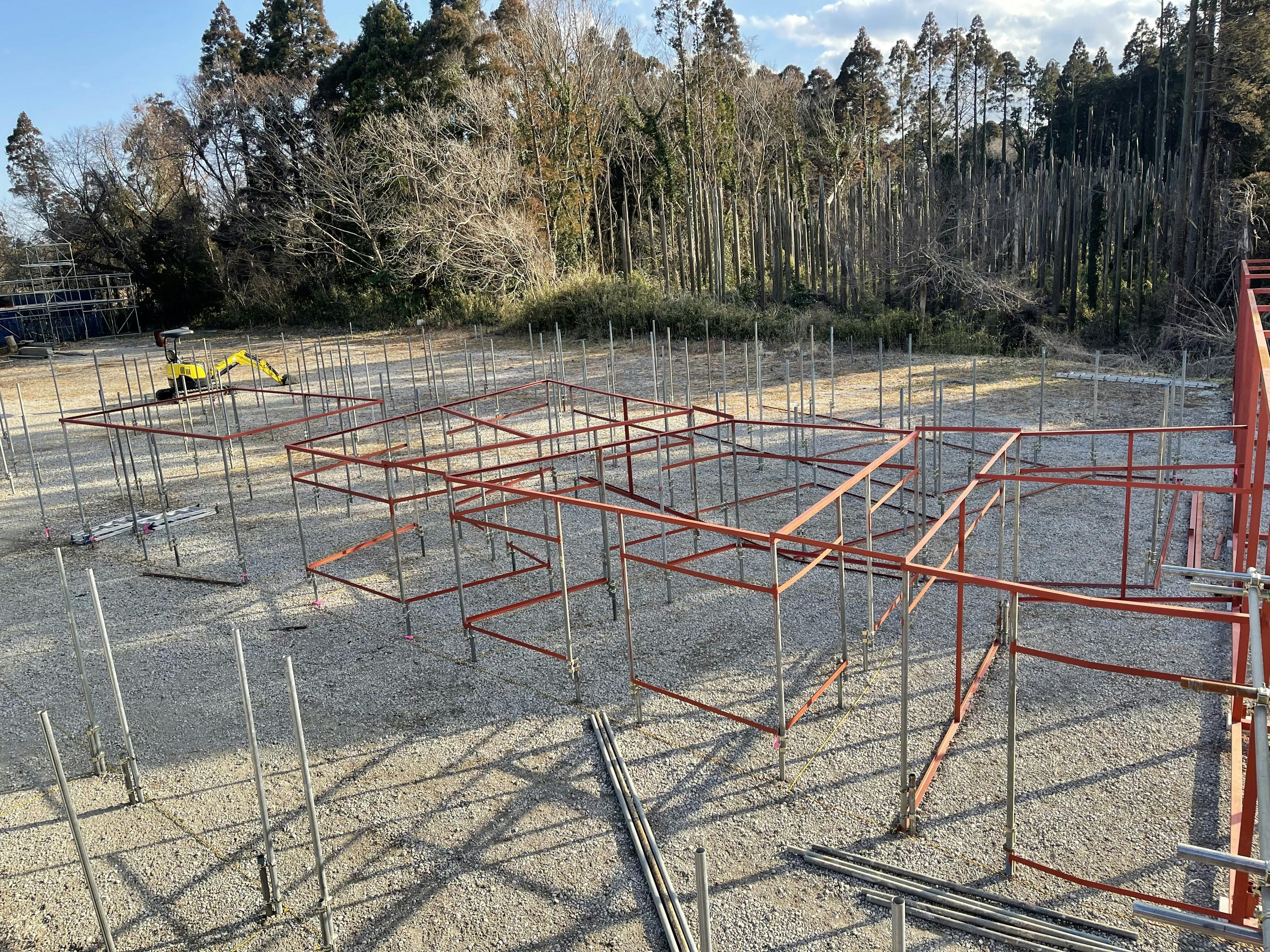 ・元駐車場に設計図に倣って虎ロープを張り単管を埋めていきました。