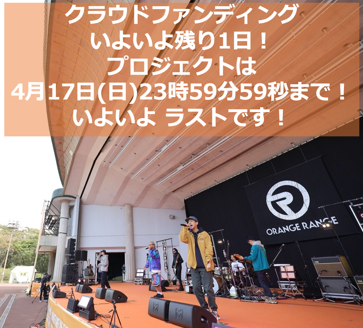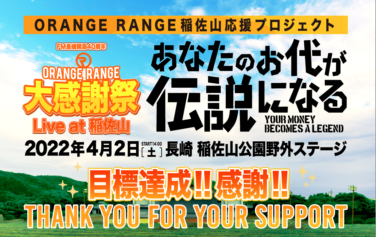 2022/04/18 00:09ORANGE RANGEと稲佐山 応援プロジェクト 目標達成で終了いたしました!ご支援&応援していただいた皆さん、関係者の皆さま、ORANGE RANGEのメンバーの皆さん 本当にありがとうございました!!!感謝の気持ちでいっぱいです!!今回は コロナ禍で新しいチャレンジでした。前例のない開催でのスタイルでしたが ORANGE RANGEの皆さんが 私たちの企画に賛同いただき、そして 表に立ってくれたこと 心より感謝いたします!だからこそ、ORANGE RANGEの名前が入った初めてのクラウドファンディングのプロジェクト、ORANGE RANGEが今まで 築いてこられた信頼を使わせていただいた 今回のクラウドファンディングの稲佐山プロジェクトは どうしても 成功させたい気持ちでした。応援&ご支援いただいた皆さまには、 順に リターンアイテムをお届けさせていただくことで、私たちからの御礼の気持ちをお伝えさせていただきたいと思ってます。そんな稲佐山実行委員会より、今回の企画の続きで 一つ お願いがあります。来月 2022年5月14日、15日 と神奈川県のぴあアリーナMMで ORANGE RANGEの盛大なスペシャルライブが開催されます!https://okinawa.orangerange.com/21th/succ.phpこの日は 沖縄本土返還50周年の日となります。50年前の 5月14日は沖縄はまだアメリカでした。50年前の 5月15日に沖縄が日本に返還されました。沖縄のバンドだからこそ 伝わるメッセージがあると思います。長崎も平和を象徴する街で 今回の企画は色々と通じるものもありました。音楽を通して、人を豊かにし 音楽を通して楽しませてくれる ORANGE RANGEの素晴らしさを さらに知ることが出来る日になると思います!今回の稲佐山企画のように 実際にライブ会場での応援ライブ会場には来れなかったけど クラファンなどでの 応援宣伝などで 今回の企画を広めるような応援 など様々な形での 応援の仕方があると思います。ぜひ、5月14日、15日の ぴあアリーナMMの成功に向けて 引き続き 熱い応援をしてもらえると嬉しいです!私たちも ここで完全燃焼で終わらず、ORANGE RANGEがさらに 広まって、色んな人を笑顔にしてゆけるように 全力でサポートしてゆきます!改めて、今回の稲佐山プロジェクトのご支援&応援 本当にありがとうございました!最後に 小声になりますが (投げ銭企画 またやりましょう!)イナサヤマーックス!!!ORANGE RANGE稲佐山実行委員会 (発起人 FM長崎・BEA) もっと見る