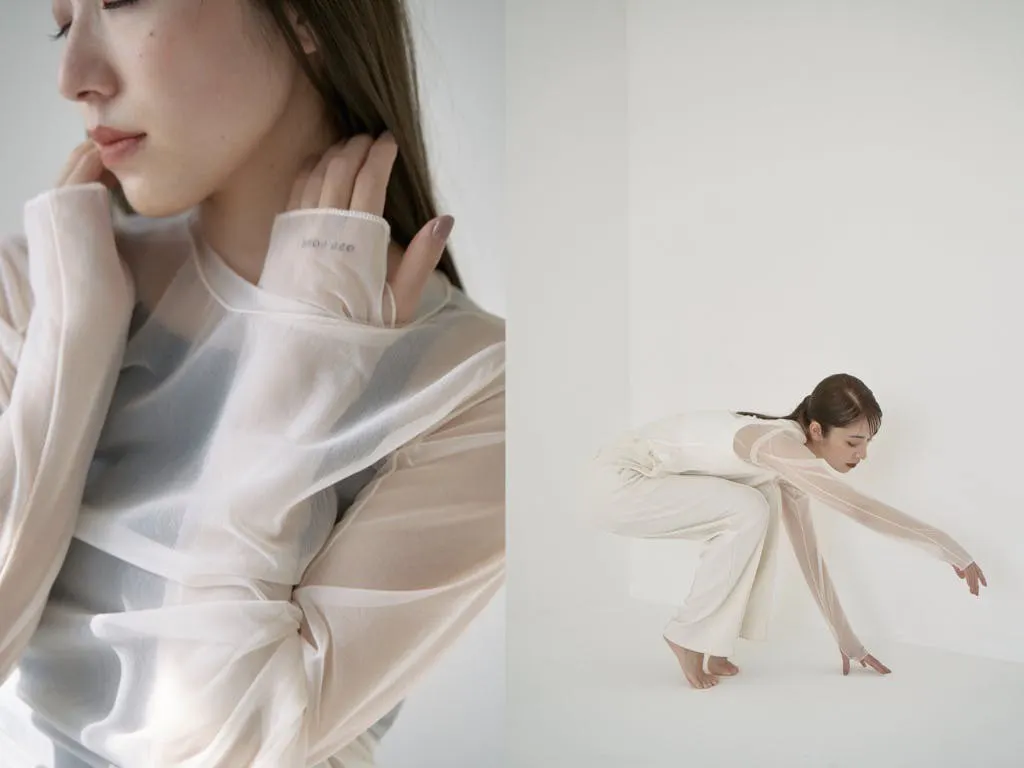 まるで衣装を纏っているようなシースルートップス。脇のスリットが動きやすさを叶え、手の甲まで覆われた袖は腕を長く見せます。左の甲にはOFF POSEの刺繍が施されています。