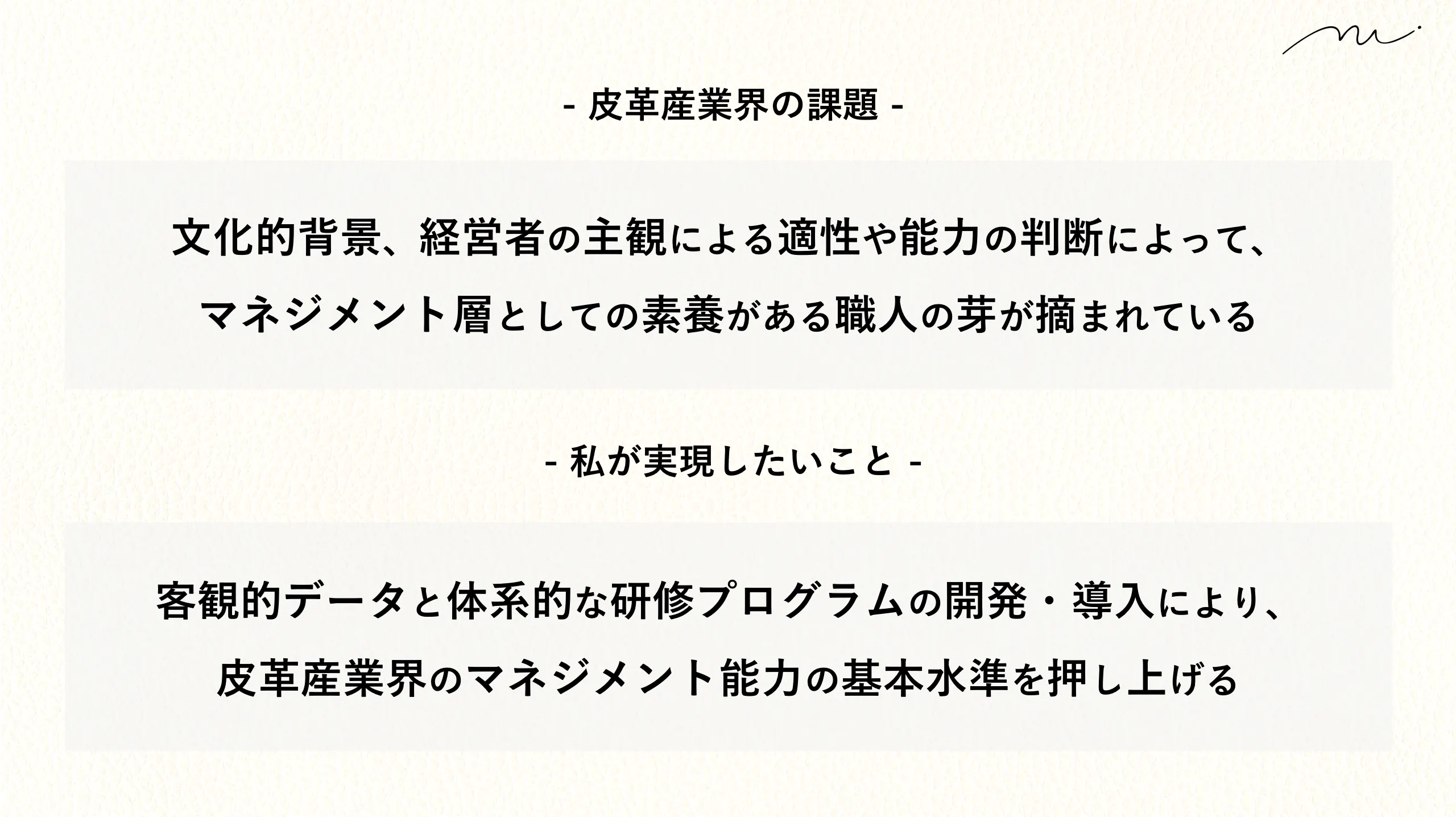 こういった現状は、指揮をとる経営者やマネジメント層などのリーダーとなる人材の主観や偏った判断基準によっても、さらに深刻化します。偏った評価制度や、敢えて挑戦をさせない価値観が皮革産業全体に蔓延していることを体感しました。