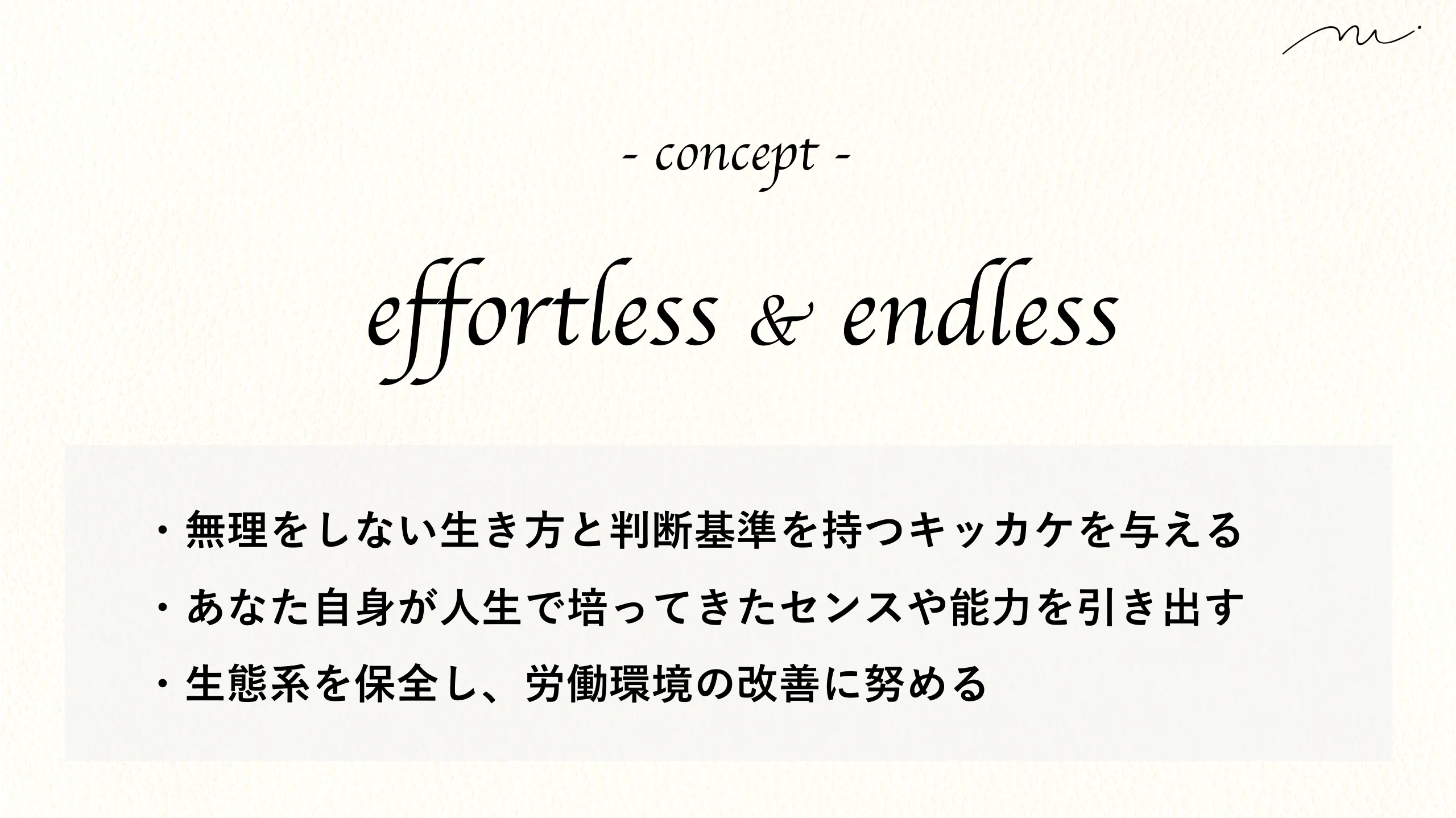 今の時代に生きる私たち一人ひとりが、自らの生き方や生き様に対する無理をしない判断基準を持つキッカケをお届けすること。