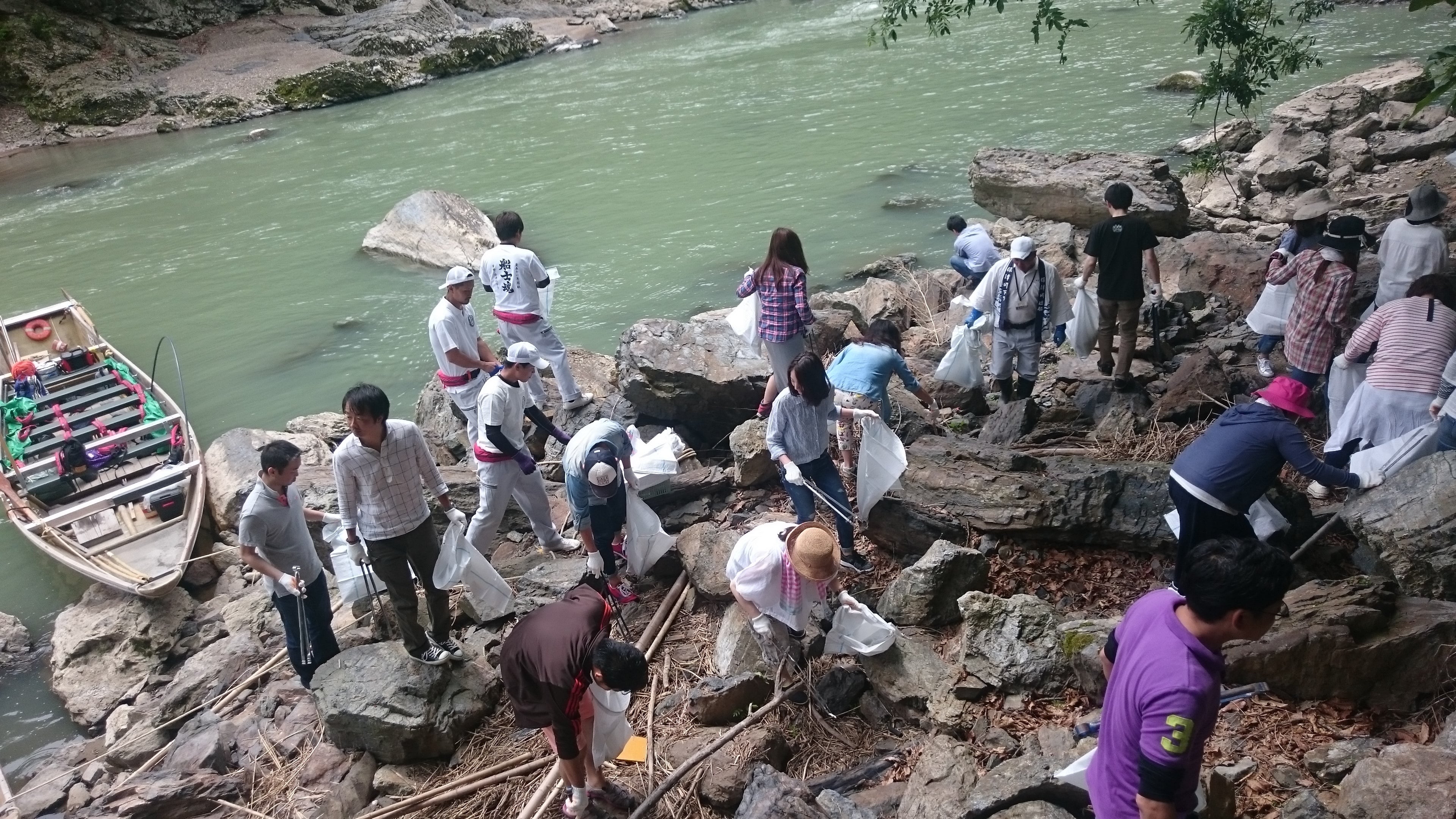 保津川遊船企業組合の環境活動を聞き、途中で船を降りてごみ拾いをするといった