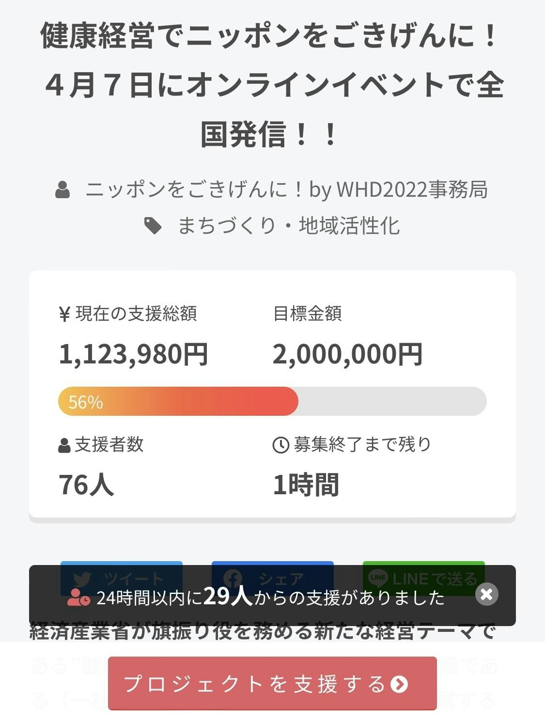 2022/03/31 23:06ごきげんな夜をお過ごしでしょうか?とうとう!本日2022年03月31日 23時59分59秒がこのプロジェクトのファンディングできるリミットのお時間です。 …あと1時間弱になりました。いよいよです。ドキドキが止まりません。このお時間までに集まった金額がファンディングされます。メンバーたちがそれぞれのモニター越しに固唾を飲んで見守る中、21時過ぎに念願の50%達成しました!!!その後もぐんぐんご支援は集まっており、22時半現在、78名の皆様のご支援のおかげで達成率56%、1,127,780円の資金をお預かりしています。誠にありがとうございますm(_ _)mまだまだ周知されてない「健康経営」という概念ですが、全国、いえ、世界中からオンラインで参加できる”JHCワールド・ヘルス・デー2022”。このオンライン開催イベントで、日本社会に心身ともに健やかで、働く意義を見出していく、健全に働ける環境を広げていきます。どうぞこの活動報告をご覧いただいている皆様、200万円の目標金額に向け、もう一息私たちは頑張りたいのです。メンバーたちが自信を持って選び、こだわって集めてきたリターン品です。お友達や仲間にオススメいただき、お広めいただけましたらこんなに嬉しいことはありません。イベント開催に向けてのクラウドファンディングも、残すところあと1時間弱。ツイッター、FBでプロジェクトページは簡単に拡散できます。皆様の拡散・支援のご協力、何卒よろしくお願いいたします。▶JHCワールド・ヘルス・デー2022 オフィシャルサイト:https://world-health-day.com/ ▶JHCワールド・ヘルス・デイ 2021 アーカイブリンク:https://peraichi.com/landing_pages/view/jhcwhd2021?msclkid=244e9f5aa63911eca7424da7f58c2d20▶株式会社 日本健康経営オフィシャルサイト:https://www.nihon-kenkokeiei.co.jp/ もっと見る