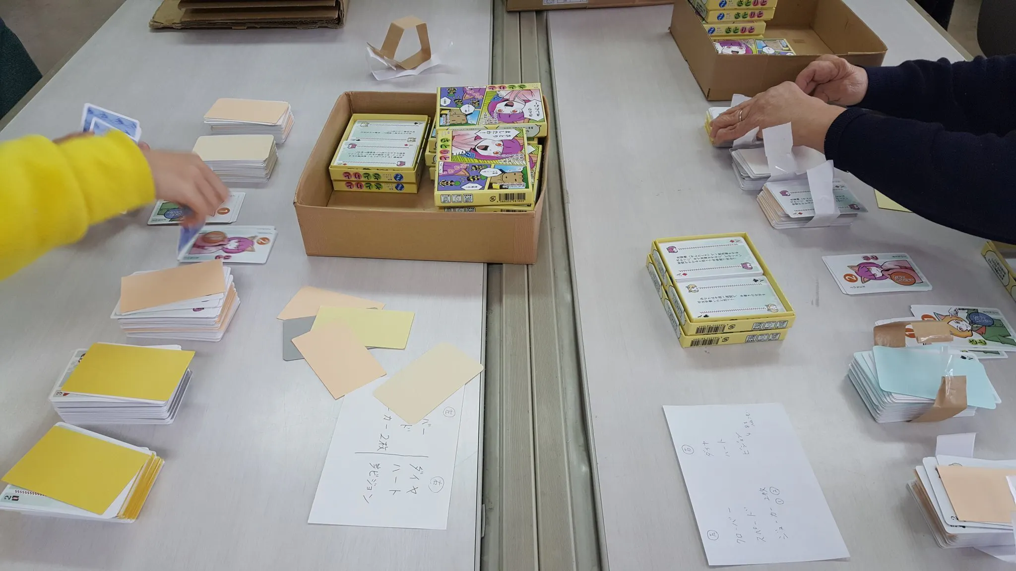 2022/02/21 21:20製作をお願いしている障害者作業施設から作業風景の写真が届きました。もう何度も施設での製作作業をお願いしているのですが、新規ゲームの製作の時には写真をお願いしています。私自身が撮影に行ったこともありましたね。写真に顔の写っている方は、ご本人に掲載許可をいただいております。追加でプロジェクト募集ページにも写真掲載を行っていきます。できるだけ余裕を持った日時で納品をお願いしていますが、読みが外れて在庫切れとなり急かしてしまったりといった失敗が過去にありました。できる限り配慮した製作依頼を今後も続けていきます。いつも製作作業ありがとうございます。 もっと見る
