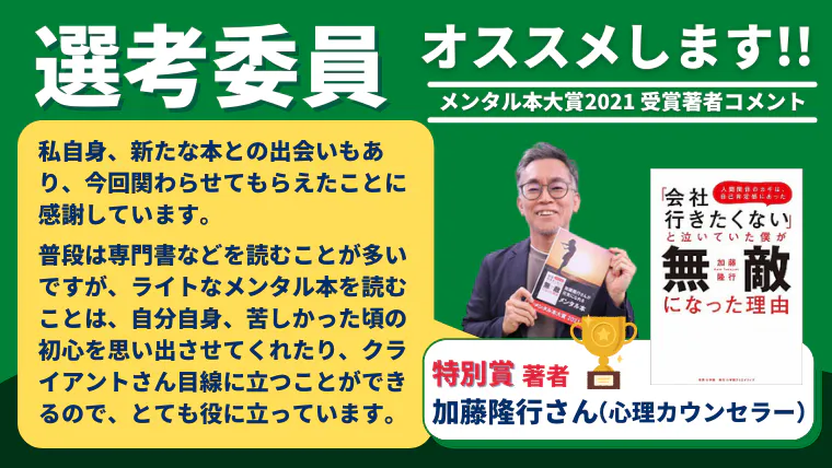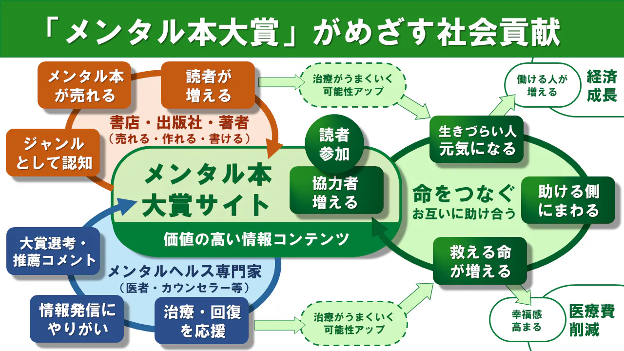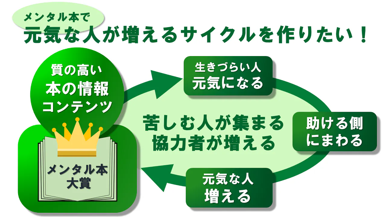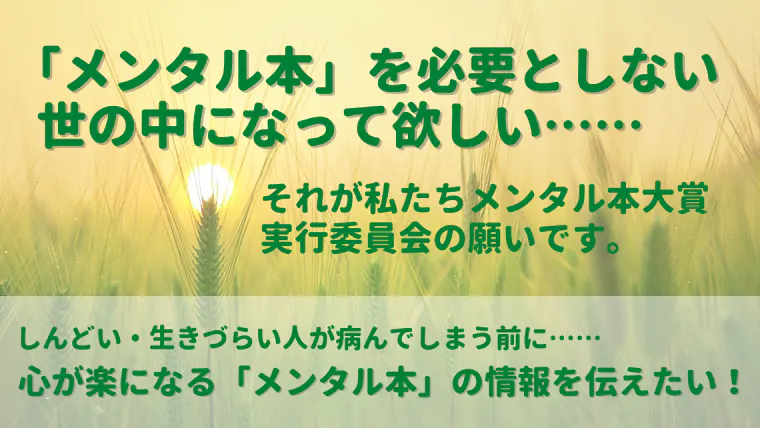 そして、「メンタル本大賞」サイトに訪れてくれる人が増えれば、「しんどい」「生きづらい」と感じて苦しんでいる人に【心が楽になる】「メンタル本」の情報が届いて、結果的に救いの手が差し伸べられるのではないかと考えています。