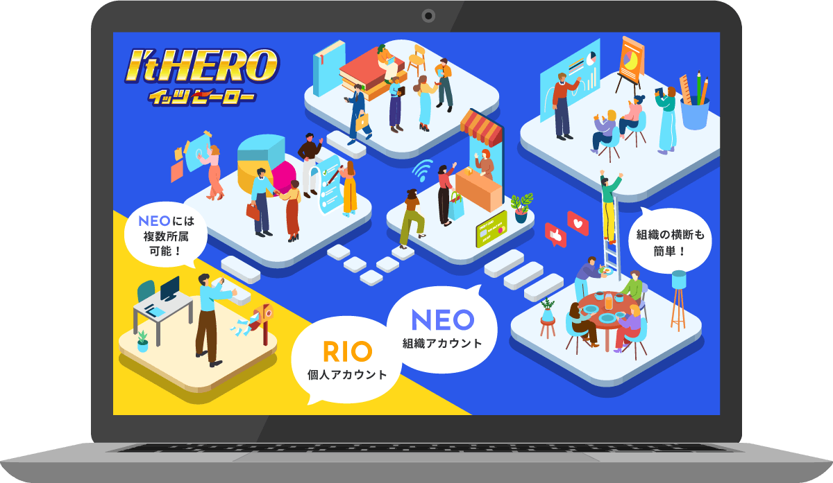 I'tHEROは、現実社会の仕組みをクラウドのデジタル空間上に、ワンタッチで組織の切り替えを可能にしたシステム。