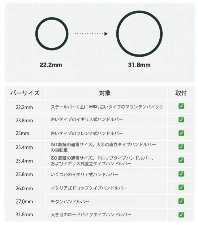 ※22.2mm~31.8mmの範囲内のバーは使用可能です