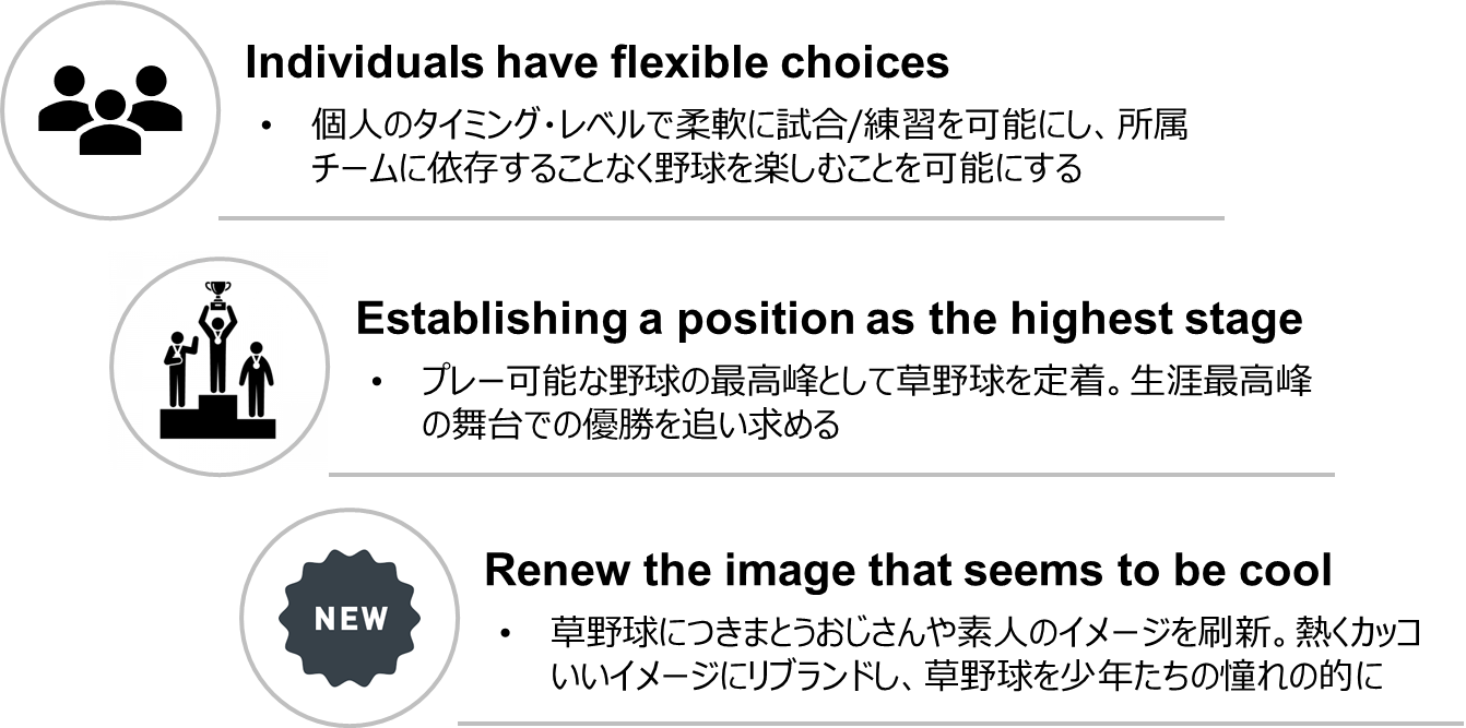 また、プレーができる最高峰のステージとして草野球を定着させ、甲子園を目指した頃のような本気度で草野球に取り組めるようにすること、
